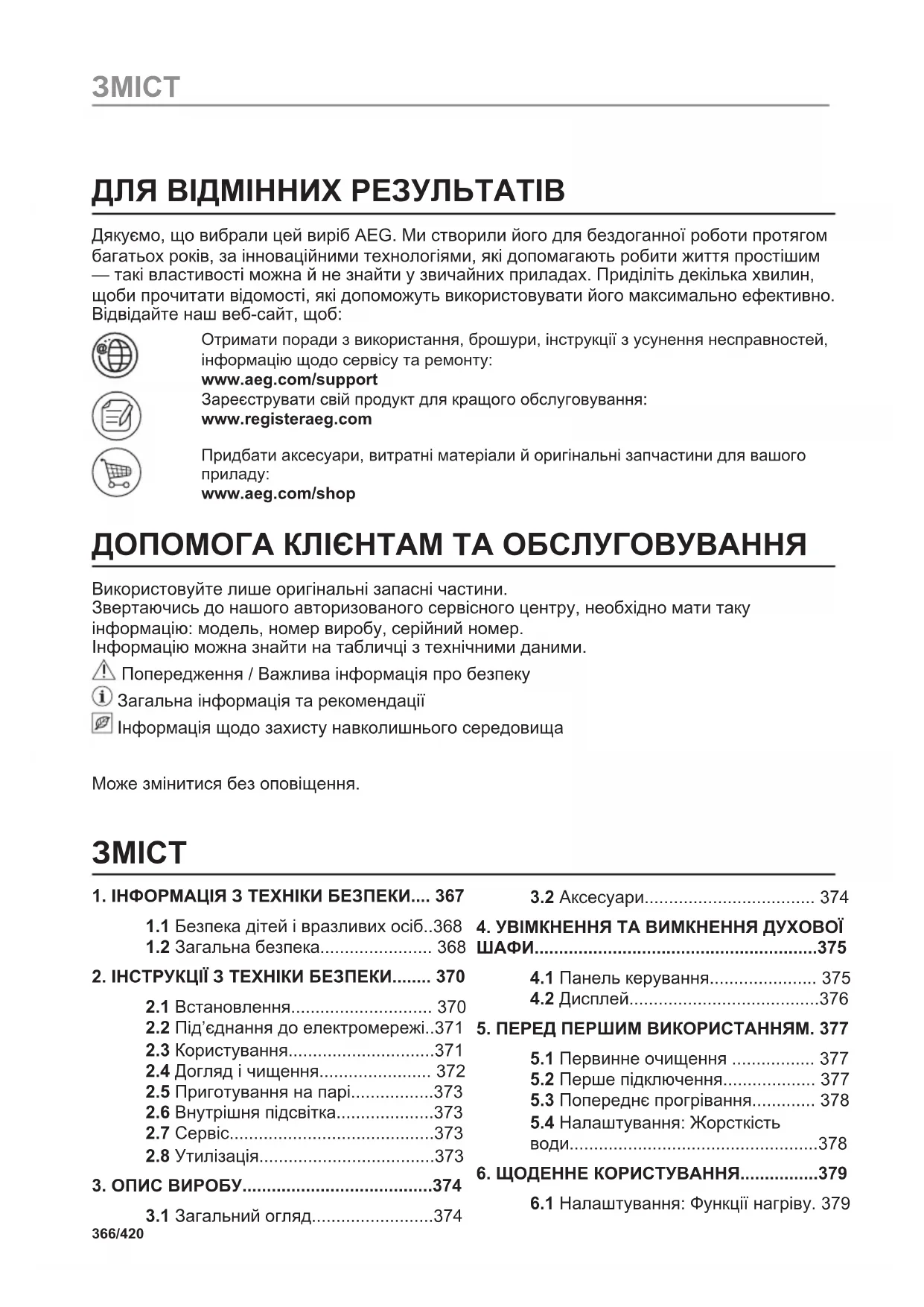Материалы с символом следует сдавать на переработку. Положите упаковку в соответствующие контейнеры для сбора вторичного сырья. Принимая участие в переработке старого электробытового оборудования, Вы помогаете защитить окружающую среду и здоровье человека. Не выбрасывайте вместе с бытовыми отходами бытовую технику, помеченную символом . Прибор следует доставить в место раздельного накопления и сбора отходов потребления или в пункт сбора использованной бытовой техники для последующей утилизации. 365/420 ПРОБУЙТЕ!ДЛЯ ВІДМІННИХ РЕЗУЛЬТАТІВ Дякуємо, що вибрали цей виріб AEG. Ми створили його для бездоганної роботи протягом багатьох років, за інноваційними технологіями, які допомагають робити життя простішим — такі властивості можна й не знайти у звичайних приладах. Приділіть декілька хвилин, щоби прочитати відомості, які допоможуть використовувати його максимально ефективно. Відвідайте наш веб-сайт, щоб: Отримати поради з використання, брошури, інструкції з усунення несправностей, інформацію щодо сервісу та ремонту: www.aeg.com/support Зареєструвати свій продукт для кращого обслуговування: www.registeraeg.com Придбати аксесуари, витратні матеріали й оригінальні запчастини для вашого
