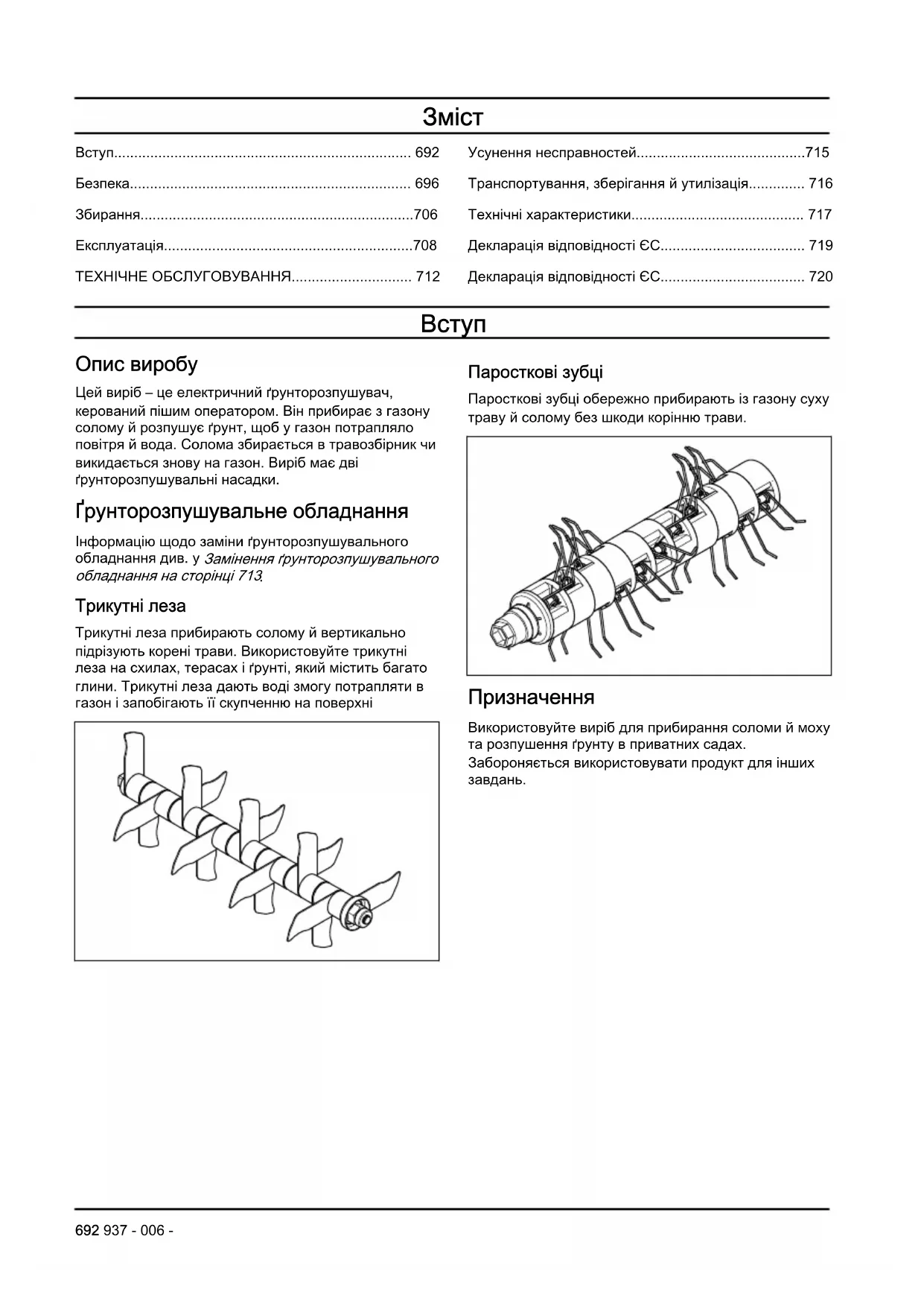 Опис виробу Цей виріб – це електричний ґрунторозпушувач, керований пішим оператором. Він прибирає з газону солому й розпушує ґрунт, щоб у газон потрапляло повітря й вода. Солома збирається в травозбірник чи викидається знову на газон. Виріб має дві ґрунторозпушувальні насадки. Ґрунторозпушувальне обладнання Інформацію щодо заміни ґрунторозпушувального обладнання див. у Замінення ґрунторозпушувального обладнання на сторінці 713