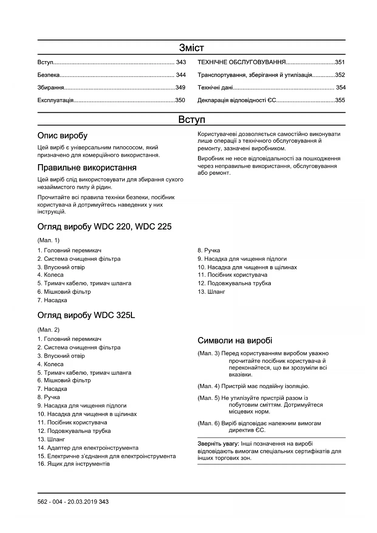 Опис виробу Цей виріб є універсальним пилососом, який призначено для комерційного використання. Правильне використання Цей виріб слід використовувати для збирання сухого незаймистого пилу й рідин. Прочитайте всі правила техніки безпеки, посібник користувача й дотримуйтесь наведених у них інструкцій. Користувачеві дозволяється самостійно виконувати лише операції з технічного обслуговування й ремонту, зазначені виробником. Виробник не несе відповідальності за пошкодження через неправильне використання, обслуговування або ремонт. Огляд виробу WDC 220, WDC 225 (Мал. 1)