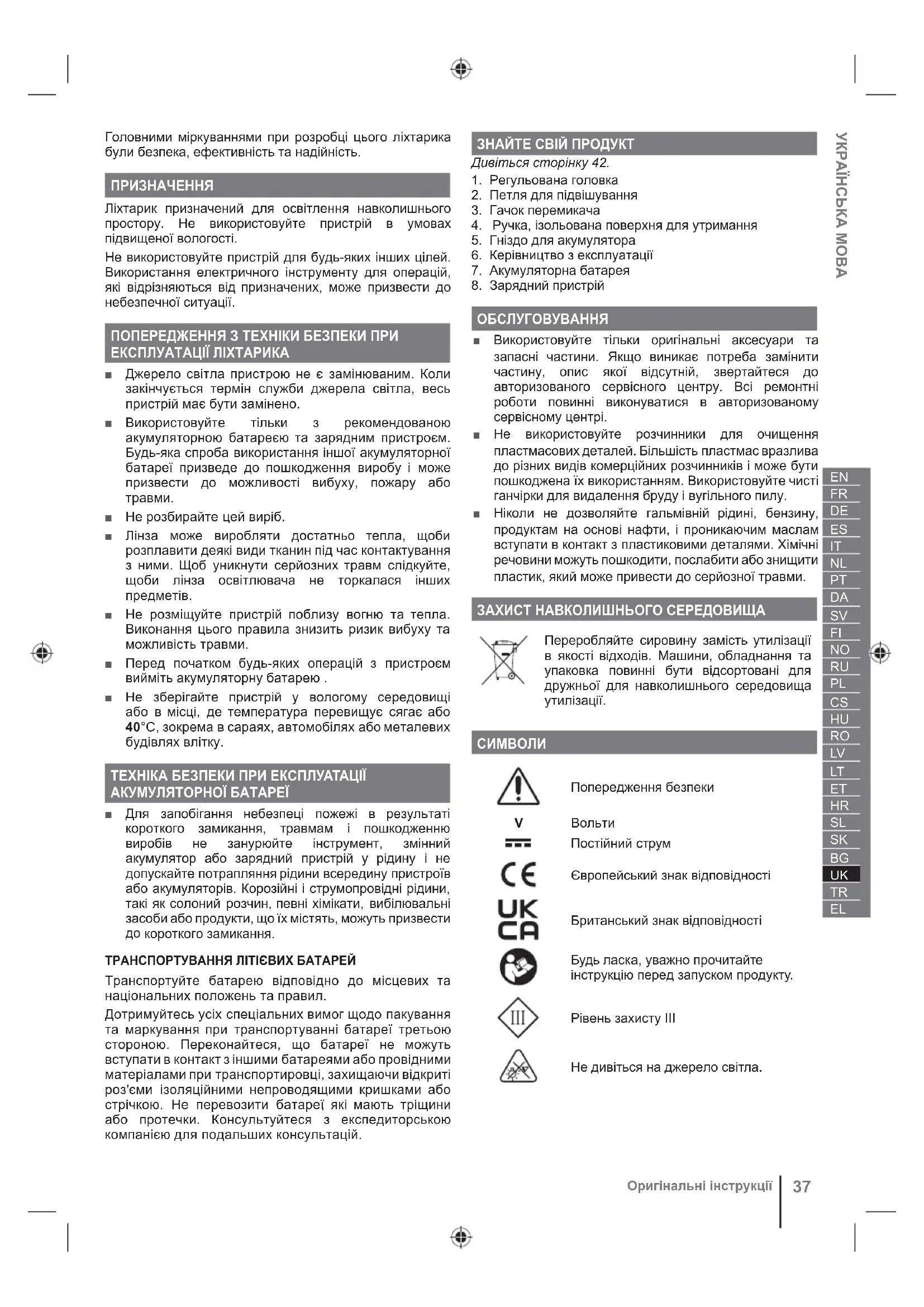 Превод от оригиналните инструкцииГоловними міркуваннями при розробці цього ліхтарика були безпека, ефективність та надійність. ПРИЗНАЧЕННЯ Ліхтарик призначений для освітлення навколишнього простору. Не використовуйте пристрій в умовах підвищеної вологості. Не використовуйте пристрій для будь-яких інших цілей. Використання електричного інструменту для операцій, які відрізняються від призначених, може призвести до небезпечної ситуації. ПОПЕРЕДЖЕННЯ З ТЕХНІКИ БЕЗПЕКИ ПРИ ЕКСПЛУАТАЦІЇ ЛІХТАРИКА ■ Джерело світла пристрою не є замінюваним. Коли закінчується термін служби джерела світла, весь пристрій має бути замінено. ■ Використовуйте тільки з рекомендованою акумуляторною батареєю та зарядним пристроєм. Будь-яка спроба використання іншої акумуляторної батареї призведе до пошкодження виробу і може призвести до можливості вибуху, пожару або