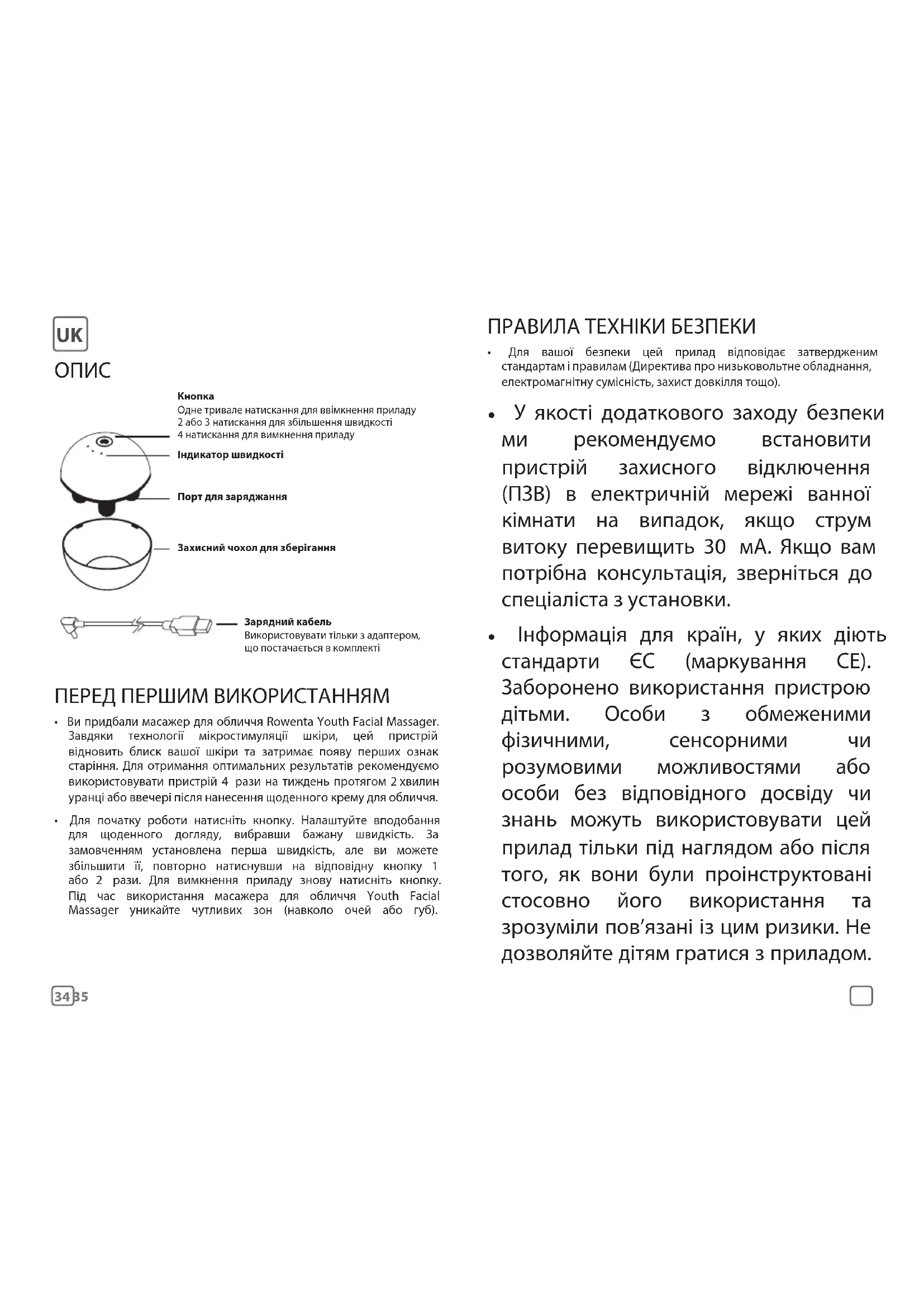 - Для початку роботи натисніть кнопку. Налаштуйте вподобання для щоденного догляду, вибравши бажану швидкість. За замовченням установлена перша швидкість, але ви можете збільшити її, повторно натиснувши на відповідну кнопку 1 або 2 рази. Для вимкнення приладу знову натисніть кнопку. Під час використання масажера для обличчя Youth Facial Massager уникайте чутливих зон (навколо очей або губ). КнопкаОдне тривале натискання для ввімкнення приладу2 або 3натискання для збільшення швидкості4натискання для вимкнення приладуІндикатор швидкостіПорт для заряджанняЗахисний чохол для зберіганняЗарядний кабельВикористовувати тільки з адаптером, що постачається в комплекті ПРАВИЛА ТЕХНІКИ БЕЗПЕКИ