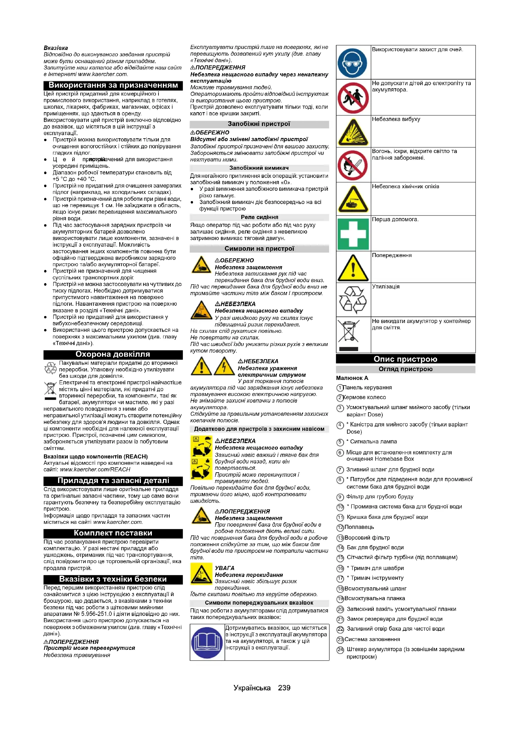 Відповідно до виконуваного завдання пристрій може бути оснащений різним приладдям. Запитуйте наш каталог або відвідайте наш сайт в Інтернеті www.kaercher.com. Використання за призначенням Цей пристрій придатний для комерційного і промислового використання, наприклад в готелях, школах, лікарнях, фабриках, магазинах, офісах і приміщеннях, що здаються в оренду. Використовувати цей пристрій виключно відповідно до вказівок, що містяться в цій інструкції з експлуатації. ● Пристрій можна використовувати тільки для очищення вологостійких і стійких до полірування гладких підлог. ●Цей пристрій призначений для використання усередині приміщень. ●Діапазон робочої температури становить від +5 °C до +40 °C. ● Пристрій не придатний для очищення замерзлих підлог (наприклад, на холодильних складах). ● Пристрій призначений для роботи при рівні води, що не перевищує 1 см. Не заїжджати в область, якщо існує ризик перевищення максимального рівня води. ●Під час застосування зарядних пристроїв чи акумуляторних батарей дозволено використовувати лише компоненти, зазначені в інструкції з експлуатації. Можливість застосування інших компонентів повинна бути офіційно підтверджена виробником зарядного пристрою та/або акумуляторної батареї. ● Пристрій не призначений для чищення суспільних транспортних доріг. ● Пристрій не можна застосовувати на чутливих до тиску підлогах. Необхідно дотримуватися припустимого навантаження на поверхню