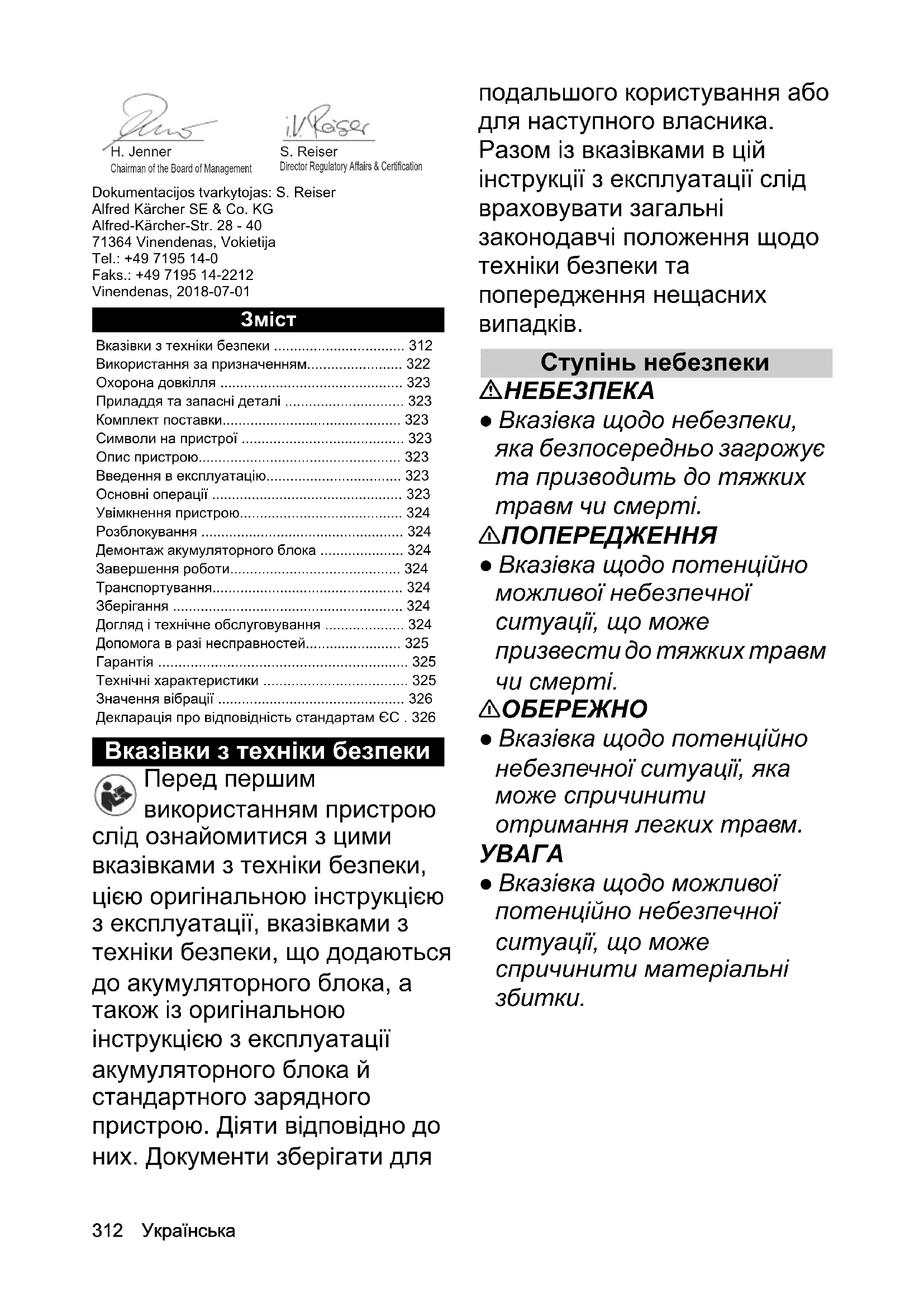Декларація про відповідність стандартам ЄС Цим ми повідомляємо, що нижче зазначена машина на основі своєї конструкції та конструктивного виконання, а також у випущеної у продаж моделі, відповідає спеціальним основним вимогам щодо безпеки та захисту здоров'я представлених нижче директив ЄС. У разі внесення неузгоджених із нами змін до машини ця заява втрачає свою чинність. Виріб: Акумуляторний сучкоріз Тип: 1.444-020.0 Відповідні директиви ЄС 2006/42/EG (+2009/127/EG) 2011/65/ЄС 2014/30/ЄС Застосовувані гармонізовані стандарти EN 55014-1: 2017 EN 55014-2: 2015 EN 60745-1:2009+A11:2010 EN 50581: 2012 EN ISO 12100: 2010 Особи, що нижче підписалися, діють від імені та за довіреністю керівництва. Особа, відповідальна за ведення документації: Ш. Райзер (S. Reiser) Alfred Kärcher SE & Co. KG Alfred-Kärcher-Str. 28 - 40 71364 Winnenden (Germany) Тел.: +49 7195 14-0 Факс: +49 7195 14-2212 м. Вінненден, 01.07.2018