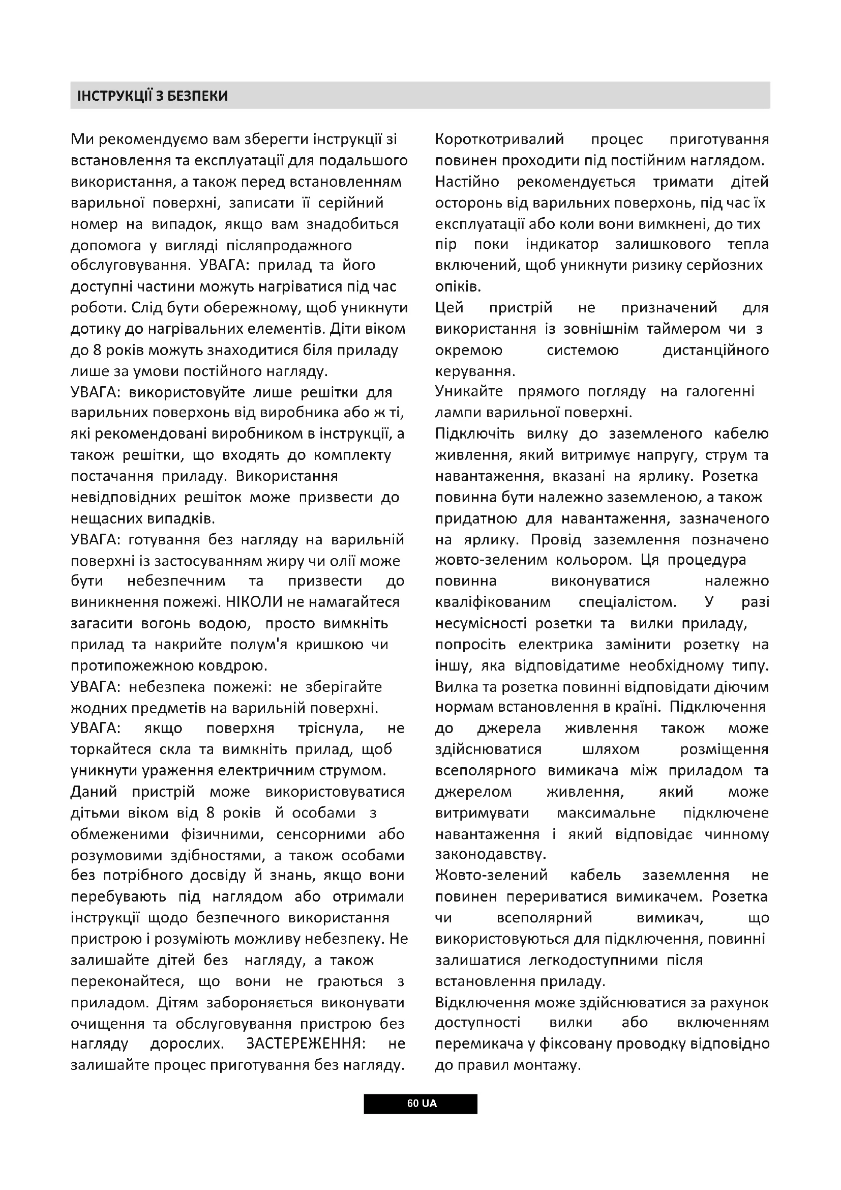 Ми рекомендуємо вам зберегти інструкції зі встановлення та експлуатації для подальшого використання, а також перед встановленням варильної поверхні, записати її серійний номер на випадок, якщо вам знадобиться допомога у вигляді післяпродажного обслуговування. УВАГА: прилад та його доступні частини можуть нагріватися під час роботи. Слід бути обережному, щоб уникнути дотику до нагрівальних елементів. Діти віком до 8 років можуть знаходитися біля приладу лише за умови постійного нагляду. УВАГА: використовуйте лише решітки для варильних поверхонь від виробника або ж ті, які рекомендовані виробником в інструкції, а також решітки, що входять до комплекту постачання приладу. Використання невідповідних решіток може призвести до нещасних випадків. УВАГА: готування без нагляду на варильній поверхні із застосуванням жиру чи олії може бути небезпечним та призвести до виникнення пожежі. НІКОЛИ не намагайтеся загасити вогонь водою, просто вимкніть прилад та накрийте полум'я кришкою чи протипожежною ковдрою. УВАГА: небезпека пожежі: не зберігайте жодних предметів на варильній поверхні. УВАГА: якщо поверхня тріснула, не торкайтеся скла та вимкніть прилад, щоб уникнути ураження електричним струмом. Даний пристрій може використовуватися дітьми віком від 8 років й особами з обмеженими фізичними, сенсорними або розумовими здібностями, а також особами без потрібного досвіду й знань, якщо вони перебувають під наглядом або отримали інструкції щодо безпечного використання пристрою і розуміють можливу небезпеку. Не залишайте дітей без нагляду, а також переконайтеся, що вони не граються з приладом. Дітям забороняється виконувати очищення та обслуговування пристрою без нагляду дорослих. ЗАСТЕРЕЖЕННЯ: не залишайте процес приготування без нагляду. Короткотривалий процес приготування повинен проходити під постійним наглядом. Настійно рекомендується тримати дітей осторонь від варильних поверхонь, під час їх експлуатації або коли вони вимкнені, до тих пір поки індикатор залишкового тепла включений, щоб уникнути ризику серйозних