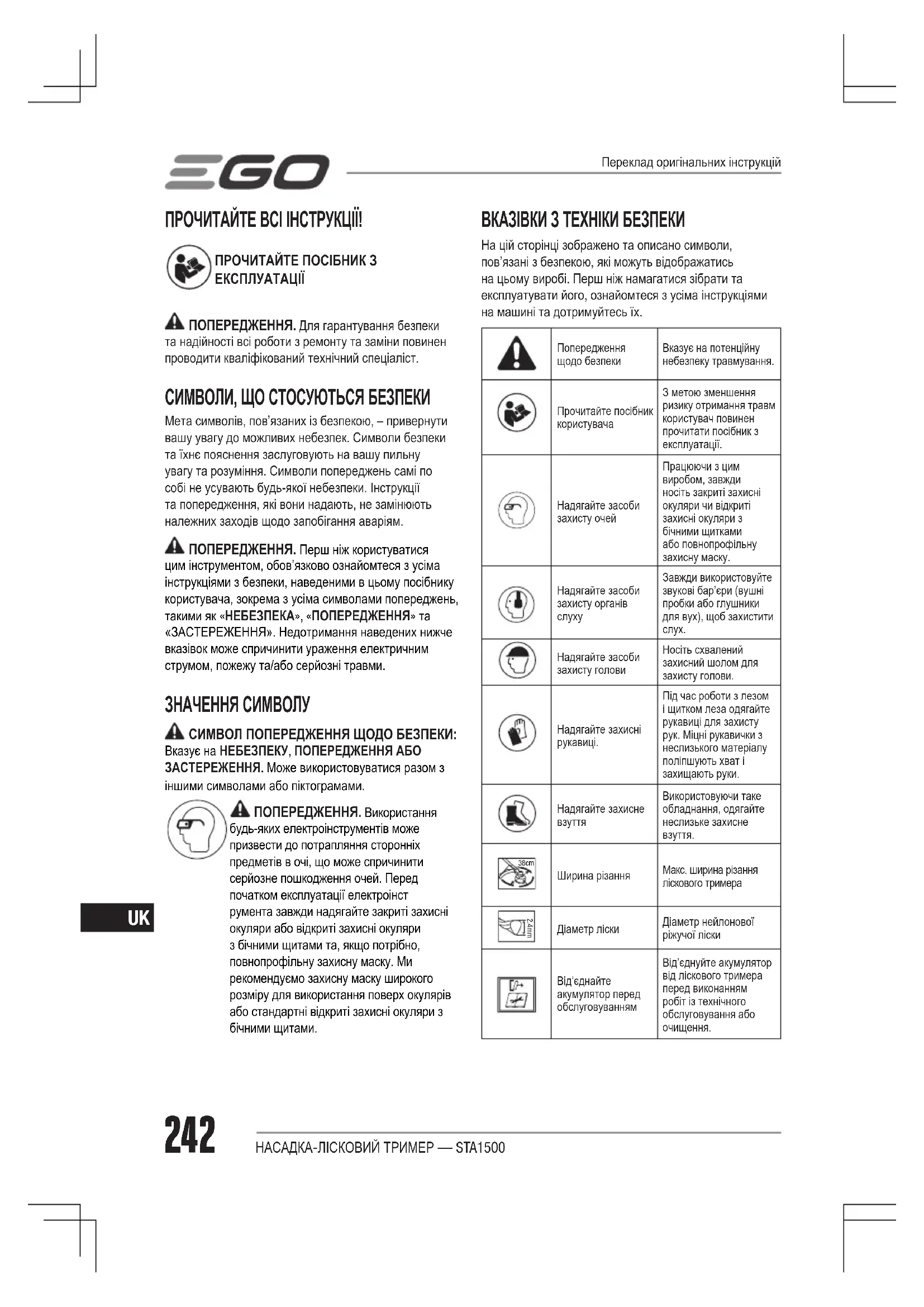 ПРОЧИТАЙТЕ ВСІ ІНСТРУКЦІЇ! ПРОЧИТАЙТЕ ПОСІБНИК З ЕКСПЛУАТАЦІЇ ПОПЕРЕДЖЕННЯ. Для гарантування безпеки та надійності всі роботи з ремонту та заміни повинен проводити кваліфікований технічний спеціаліст. СИМВОЛИ, ЩО СТОСУЮТЬСЯ БЕЗПЕКИ Мета символів, пов’язаних із безпекою, – привернути вашу увагу до можливих небезпек. Символи безпеки та їхнє пояснення заслуговують на вашу пильну увагу та розуміння. Символи попереджень самі по собі не усувають будь-якої небезпеки. Інструкції та попередження, які вони надають, не замінюють належних заходів щодо запобігання аваріям. ПОПЕРЕДЖЕННЯ. Перш ніж користуватися цим інструментом, обов’язково ознайомтеся з усіма інструкціями з безпеки, наведеними в цьому посібнику користувача, зокрема з усіма символами попереджень, такими як «НЕБЕЗПЕКА», «ПОПЕРЕДЖЕННЯ» та «ЗАСТЕРЕЖЕННЯ». Недотримання наведених нижче вказівок може спричинити ураження електричним струмом, пожежу та/або серйозні травми. ЗНАЧЕННЯ СИМВОЛУ СИМВОЛ ПОПЕРЕДЖЕННЯ ЩОДО БЕЗПЕКИ: Вказує на НЕБЕЗПЕКУ, ПОПЕРЕДЖЕННЯ АБО ЗАСТЕРЕЖЕННЯ. Може використовуватися разом з іншими символами або піктограмами. ПОПЕРЕДЖЕННЯ. Використання будь-яких електроінструментів може призвести до потрапляння сторонніх предметів в очі, що може спричинити серйозне пошкодження очей. Перед початком експлуатації електроінст румента завжди надягайте закриті захисні окуляри або відкриті захисні окуляри з бічними щитами та, якщо потрібно, повнопрофільну захисну маску. Ми рекомендуємо захисну маску широкого розміру для використання поверх окулярів або стандартні відкриті захисні окуляри з бічними щитами. ВКАЗІВКИ З ТЕХНІКИ БЕЗПЕКИ На цій сторінці зображено та описано символи, пов’язані з безпекою, які можуть відображатись на цьому виробі. Перш ніж намагатися зібрати та експлуатувати його, ознайомтеся з усіма інструкціями на машині та дотримуйтесь їх.Попередження щодо безпекиВказує на потенційну небезпеку травмування.Прочитайте посібник користувачаЗ метою зменшення ризику отримання травм користувач повинен прочитати посібник з експлуатації.Надягайте засоби захисту очейПрацюючи з цим виробом, завжди носіть закриті захисні окуляри чи відкриті захисні окуляри з бічними щитками або повнопрофільну захисну маску.Надягайте засоби захисту органів слухуЗавжди використовуйте звукові бар’єри (вушні пробки або глушники для вух), щоб захистити слух.Надягайте засоби захисту головиНосіть схвалений захисний шолом для захисту голови.Надягайте захисні рукавиці.Під час роботи з лезом і щитком леза одягайте рукавиці для захисту рук. Міцні рукавички з неслизького матеріалу поліпшують хват і захищають руки.Надягайте захисне взуттяВикористовуючи таке обладнання, одягайте неслизьке захисне взуття. 38cm Ширина різанняМакс. ширина різання ліскового тримера 2.4mmДіаметр ліскиДіаметр нейлонової ріжучої ліскиВід‘єднайте акумулятор перед обслуговуваннямВід’єднуйте акумулятор від ліскового тримера перед виконанням робіт із технічного обслуговування або очищення.Переклад оригінальних інструкційНАСАДКА-ЛІСКОВИЙ ТРИМЕР — STA1500 243