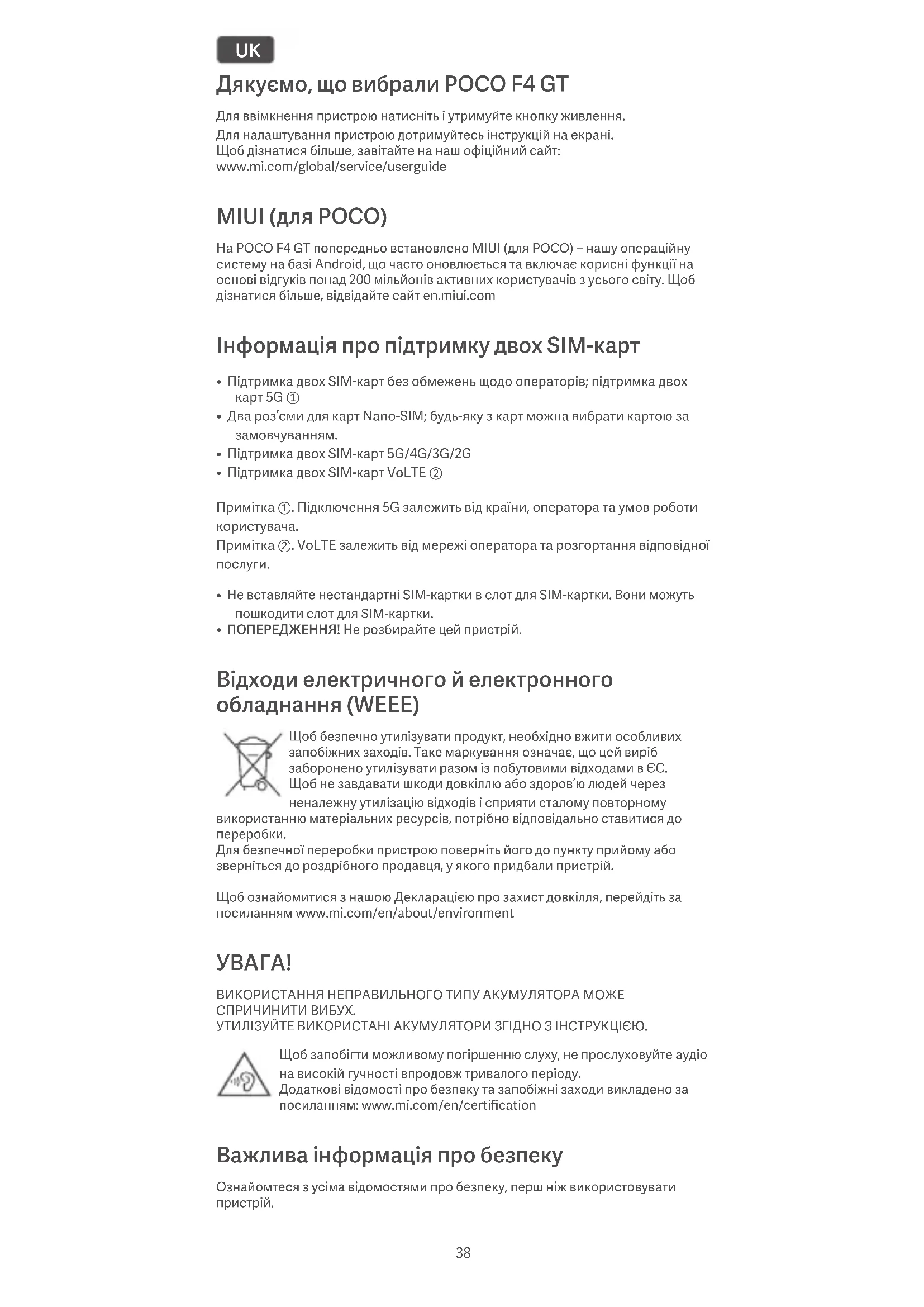 ПОСІБНИК КОРИСТУВАЧА Poco F4 GT Xiaomi