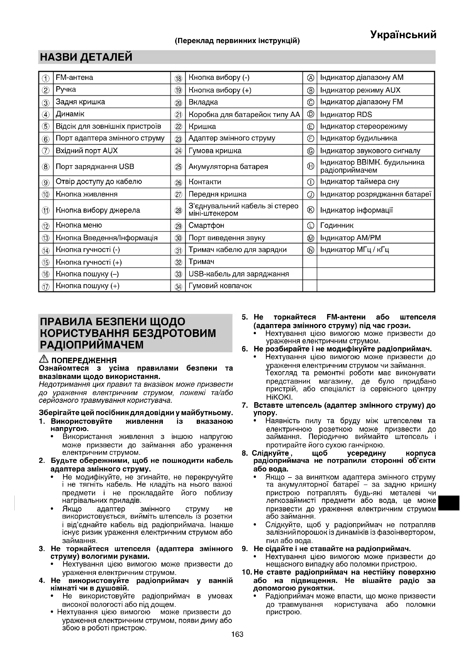 Несподівані проблеми можуть призвести до втрати або пошкодження даних, що зберігаються на смартфонах та інших периферійних пристроях, підключених до радіоприймача. Пам’ятаючи про таку небезпеку, потрібно заздалегідь робити резервні копії даних. Зважте, що HiKOKI не нестиме відповідальності за пошкодження або втрату даних, що зберігаються на смартфонах та інших периферійних пристроях, підключених до радіоприймача, ані за пошкодження самого обладнання. ОСНОВНІ ФУНКЦІЇ ○ Ручний/автоматичний режими ○ Збереження (пам'ять) (10 AM + 10 FM радіостанцій) ○ Будильник і автоматичне увімкнення/вимкнення