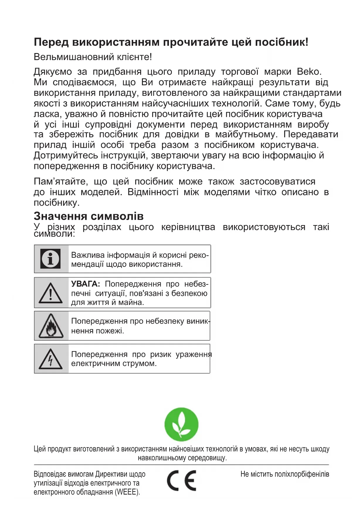 Riešenie problémovПеред використанням прочитайте цей посібник! Вельмишановний клієнте! Дякуємо за придбання цього приладу торгової марки Beko. Ми сподіваємося, що Ви отримаєте найкращі результати від використання приладу, виготовленого за найкращими стандартами якості з використанням найсучасніших технологій. Саме тому, будь ласка, уважно й повністю прочитайте цей посібник користувача й усі інші супровідні документи перед використанням виробу та збережіть посібник для довідки в майбутньому. Передавати прилад іншій особі треба разом з посібником користувача. Дотримуйтесь інструкцій, звертаючи увагу на всю інформацію й попередження в посібнику користувача. Пам’ятайте, що цей посібник може також застосовуватися до інших моделей. Відмінності між моделями чітко описано в