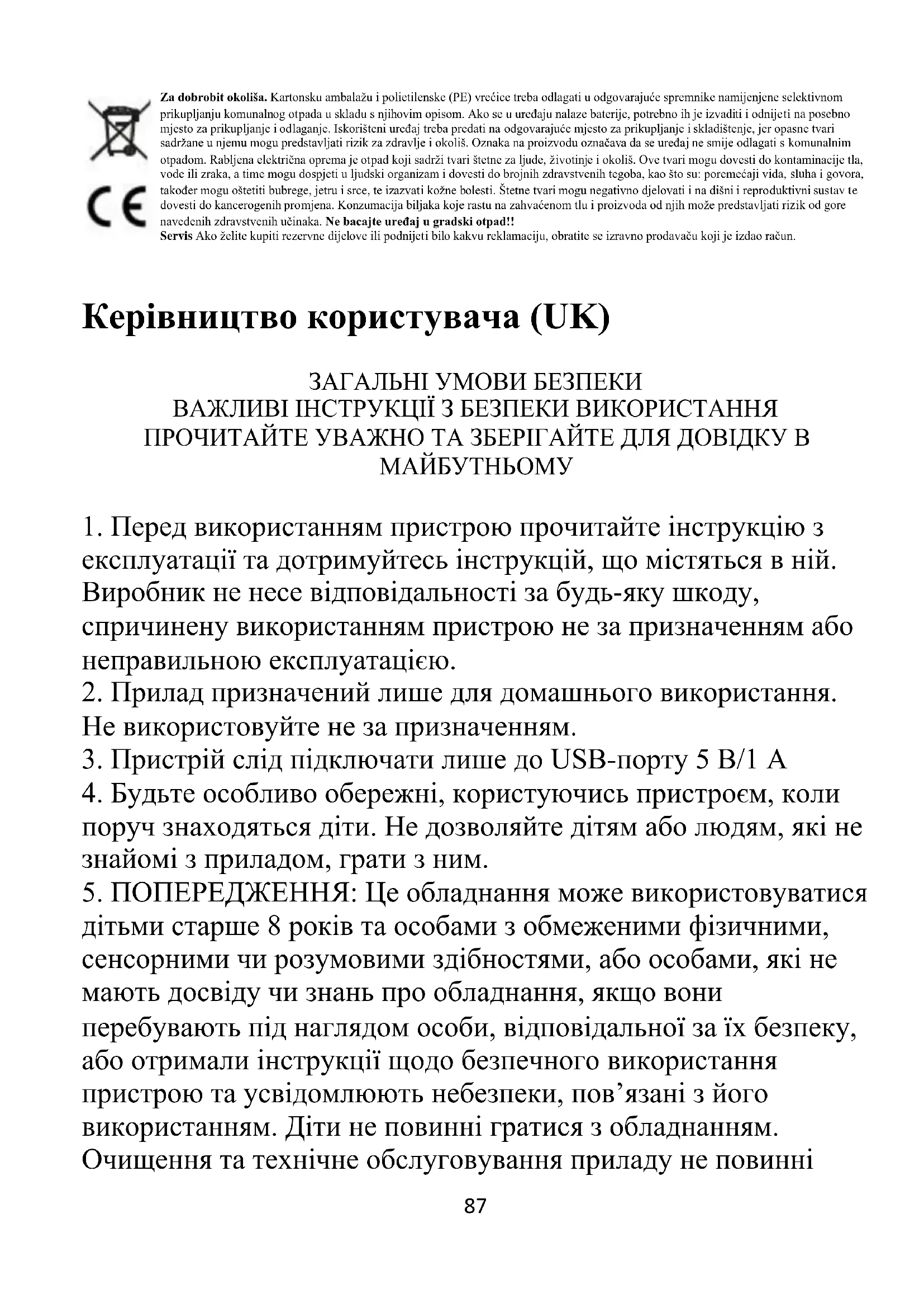 експлуатації та дотримуйтесь інструкцій, що містяться в ній. Виробник не несе відповідальності за будь-яку шкоду, спричинену використанням пристрою не за призначенням або неправильною експлуатацією.