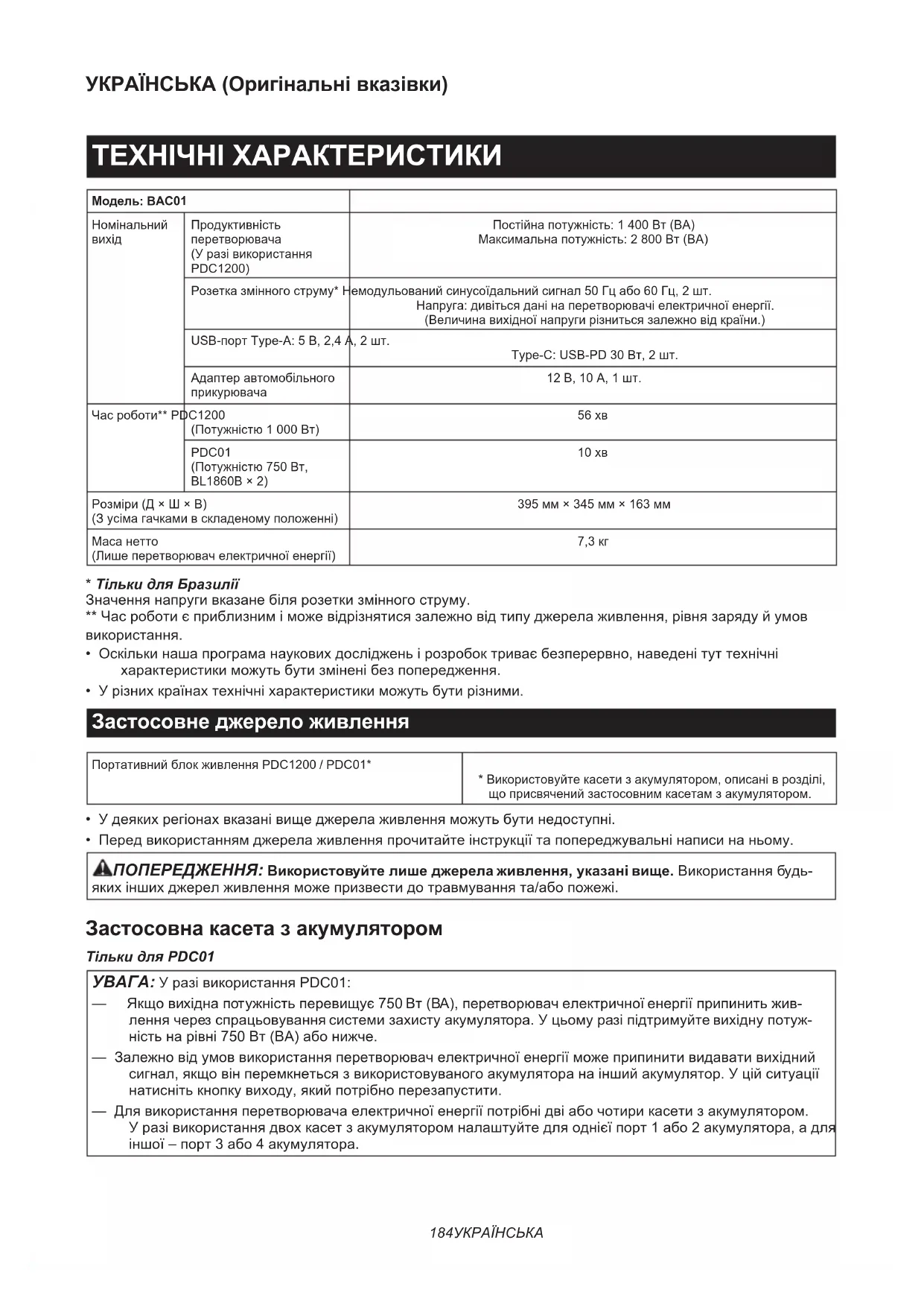 - Перед використанням джерела живлення прочитайте інструкції та попереджувальні написи на ньому. ПОПЕРЕДЖЕННЯ: Використовуйте лише джерела живлення, указані вище. Використання будь- яких інших джерел живлення може призвести до травмування та/або пожежі. Застосовна касета з акумулятором Тільки для PDC01 УВАГА: У разі використання PDC01: — Якщо вихідна потужність перевищує 750 Вт (ВА), перетворювач електричної енергії припинить жив- лення через спрацьовування системи захисту акумулятора. У цьому разі підтримуйте вихідну потуж- ність на рівні 750 Вт (ВА) або нижче. — Залежно від умов використання перетворювач електричної енергії може припинити видавати вихідний сигнал, якщо він перемкнеться з використовуваного акумулятора на інший акумулятор. У цій ситуації натисніть кнопку виходу, який потрібно перезапустити. — Для використання перетворювача електричної енергії потрібні дві або чотири касети з акумулятором. У разі використання двох касет з акумулятором налаштуйте для однієї порт 1 або 2 акумулятора, а для іншої – порт 3 або 4 акумулятора.185 УКРАЇНСЬКА Касета з акумулятором BL1815N / BL1820B / BL1830B* / BL1840B* / BL1850B* / BL1860B* *: рекомендований акумулятор