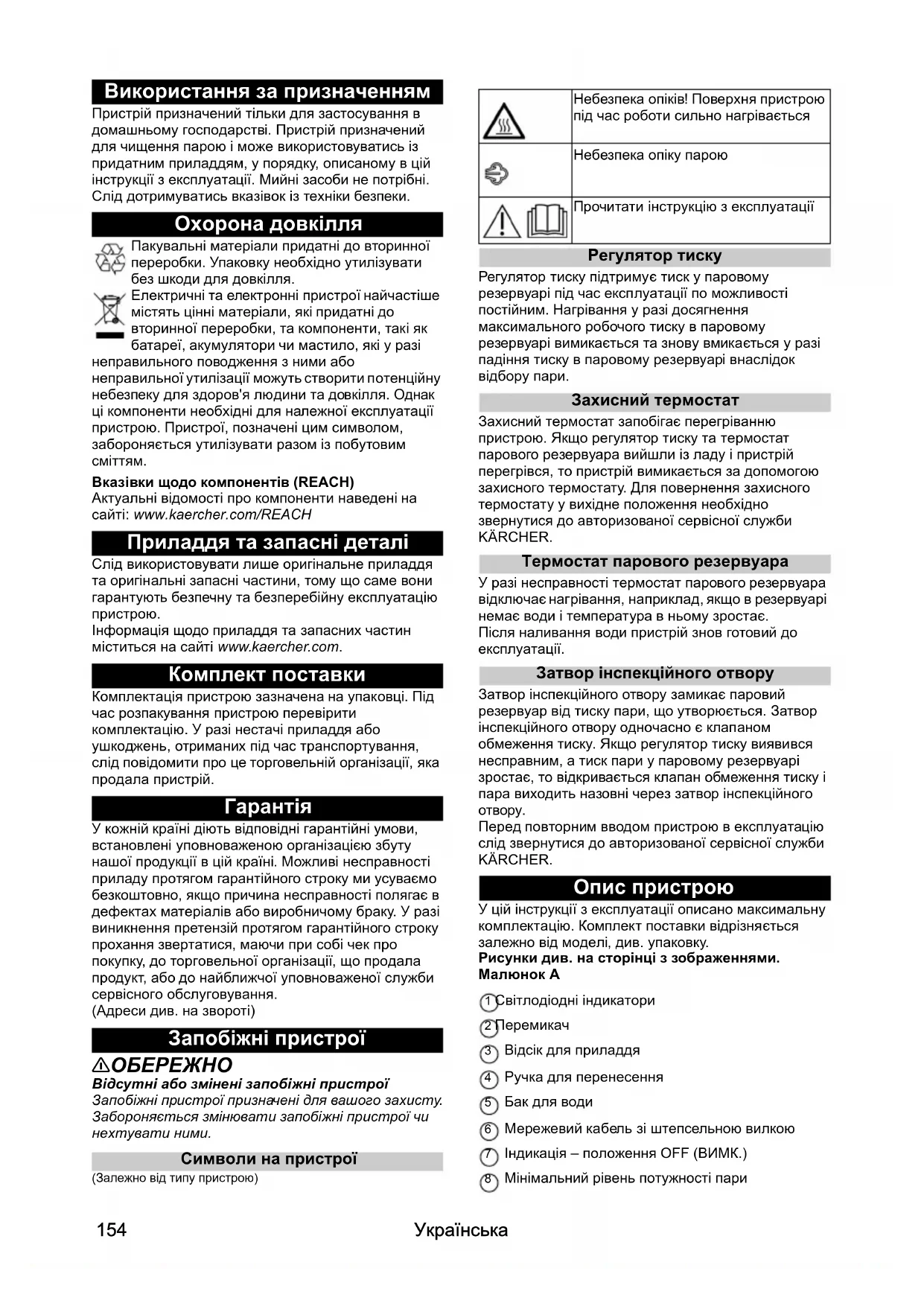 рнутися до ав торизованої сервісної служби KÄRCHER. Опис пристрою У цій інструкції з експлуатації описано максимальну комплектацію. Комплект поставки відрізняється залежно від моделі, див. упаковку. Рисунки див. на сторінці з зображеннями. Малюнок A 1 Світлодіодні індикатори 2 Перемикач 3 Відсік для приладдя 4 Ручка для перенесення 5 Бак для води 6 Мережевий кабель зі штепсельною вилкою 7 Індикація – положення OFF (ВИМК.) 8 Мінімальний рівень потужності пари Небезпека опіків! Поверхня пристрою під час роботи сильно нагрівається Небезпека опіку парою Прочитати інструкцію з експлуатаціїУкраїнська 9 Середній рівень потужності пари 10 Максимальний рівень потужності пари 11 Затвор інспекційного отвору 12 Паркувальне кріплення насадки для підлоги 13 Напрямний ролик 14 Паровий пістолет 15 Важіль подачі пари 16 Кнопка розблокування 17 Блокування кнопок від дітей 18 Паровий шланг 19 Форсунка з точковим струменем 20 Кругла щітка маленька 21 **Кругла щітка велика 22 **Силове сопло 23 Щітка для швів 24 Ручна насадка 25 Чохол з мікрофібри для ручної насадки 26 Подовжувальні трубки (2 шт.) 27 Кнопка розблокування 28 Насадка для підлоги 29 З’єднання-липучка 30 Ганчірка з мікрофібри для підлоги (1 шт.) 31 **Ганчірка для підлоги з мікрофібри (2 шт.) 32 **Розгладжувач килимів **SC 4 Deluxe EasyFix Premium