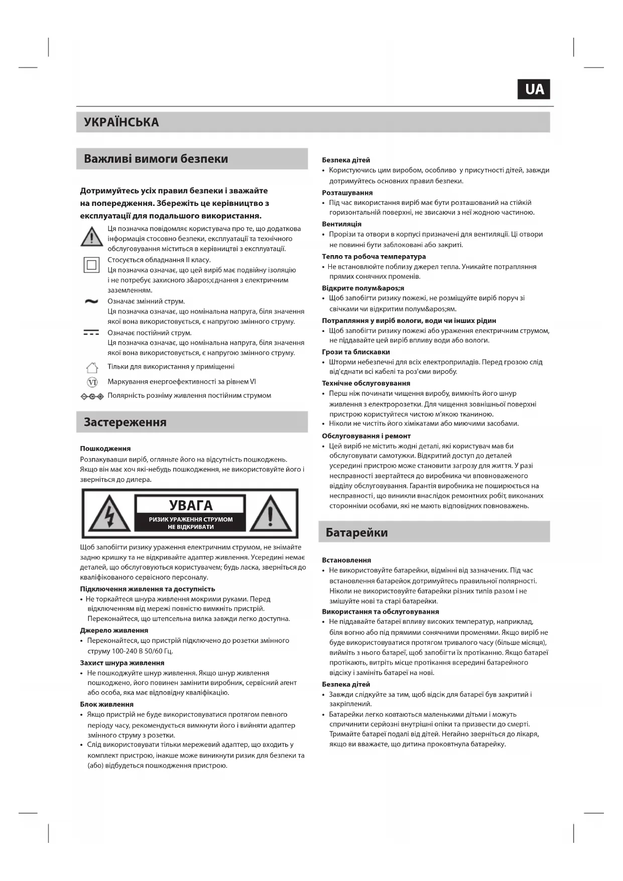 Важливі вимоги безпеки Дотримуйтесь усіх правил безпеки і зважайте на попередження. Збережіть це керівництво з експлуатації для подальшого використання. Ця позначка повідомляє користувача про те, що додаткова інформація стосовно безпеки, експлуатації та технічного обслуговування міститься в керівництві з експлуатації. Стосується обладнання II класу. Ця позначка означає, що цей виріб має подвійну ізоляцію і не потребує захисного з'єднання з електричним заземленням. Означає змінний струм. Ця позначка означає, що номінальна напруга, біля значення якої вона використовується, є напругою змінного струму. Означає постійний струм. Ця позначка означає, що номінальна напруга, біля значення якої вона використовується, є напругою змінного струму. Тільки для використання у приміщенні Маркування енергоефективності за рівнем VI Полярність розніму живлення постійним струмом Застереження Пошкодження Розпакувавши виріб, огляньте його на відсутність пошкоджень. Якщо він має хоч які-небудь пошкодження, не використовуйте його і зверніться до дилера.