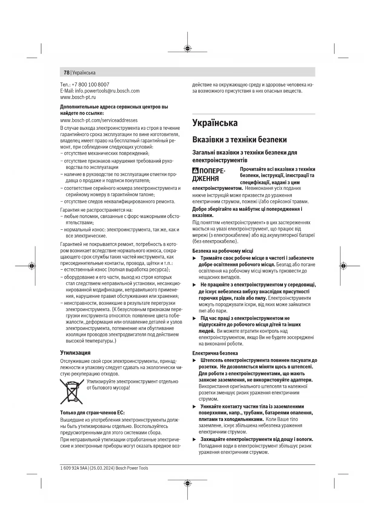 При всіх додаткових запитаннях та замовленні запчастин, будь ласка, зазначайте 10-значний номер для замовлення, що стоїть на паспортній табличці продукту. Гарантійне обслуговування і ремонт електроінструменту здійснюються відповідно до вимог і норм виготовлювача на території всіх країн лише у фірмових або авторизованих сервісних центрах фірми «Роберт Бош». ПОПЕРЕДЖЕННЯ! Використання контрафактної продукції небезпечне в експлуатації і може мати негативні наслідки для здоров’я. Виготовлення і розповсюдження контрафактної продукції переслідується за Законом в адміністративному і кримінальному порядку.