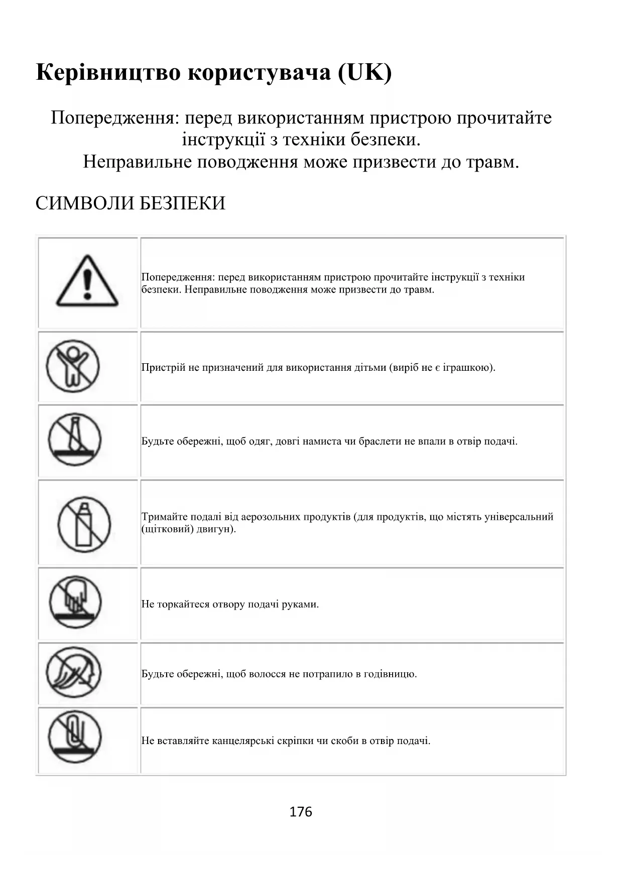 Не вставляйте канцелярські скріпки чи скоби в отвір подачі.177