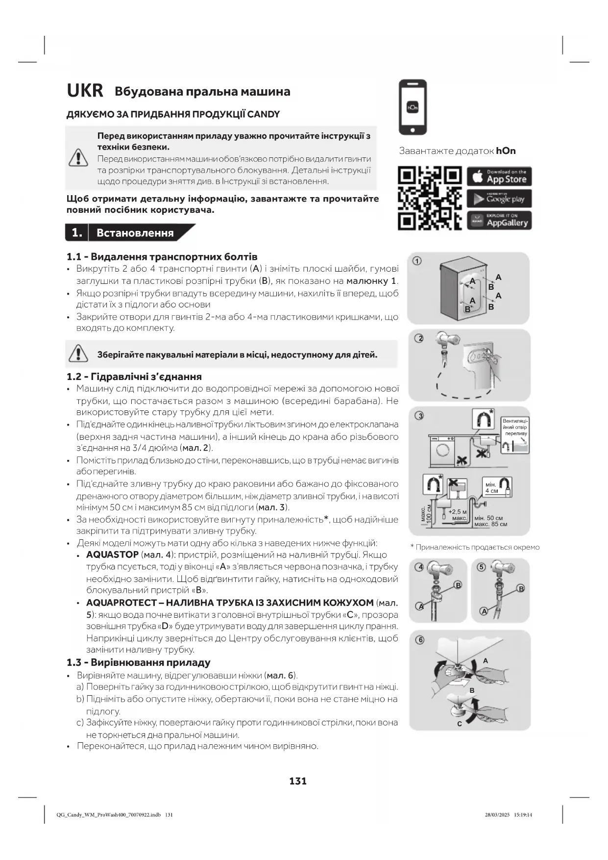 Завантажте додаток hOn UKR Вбудована пральна машина ДЯКУЄМО ЗА ПРИДБАННЯ ПРОДУКЦІЇ CANDY Перед використанням приладу уважно прочитайте інструкції з техніки безпеки. Перед використанням машини обов’язково потрібно видалити гвинти та розпірки транспортувального блокування. Детальні інструкції щодо процедури зняття див. в Інструкції зі встановлення. Щоб отримати детальну інформацію, завантажте та прочитайте повний посібник користувача.