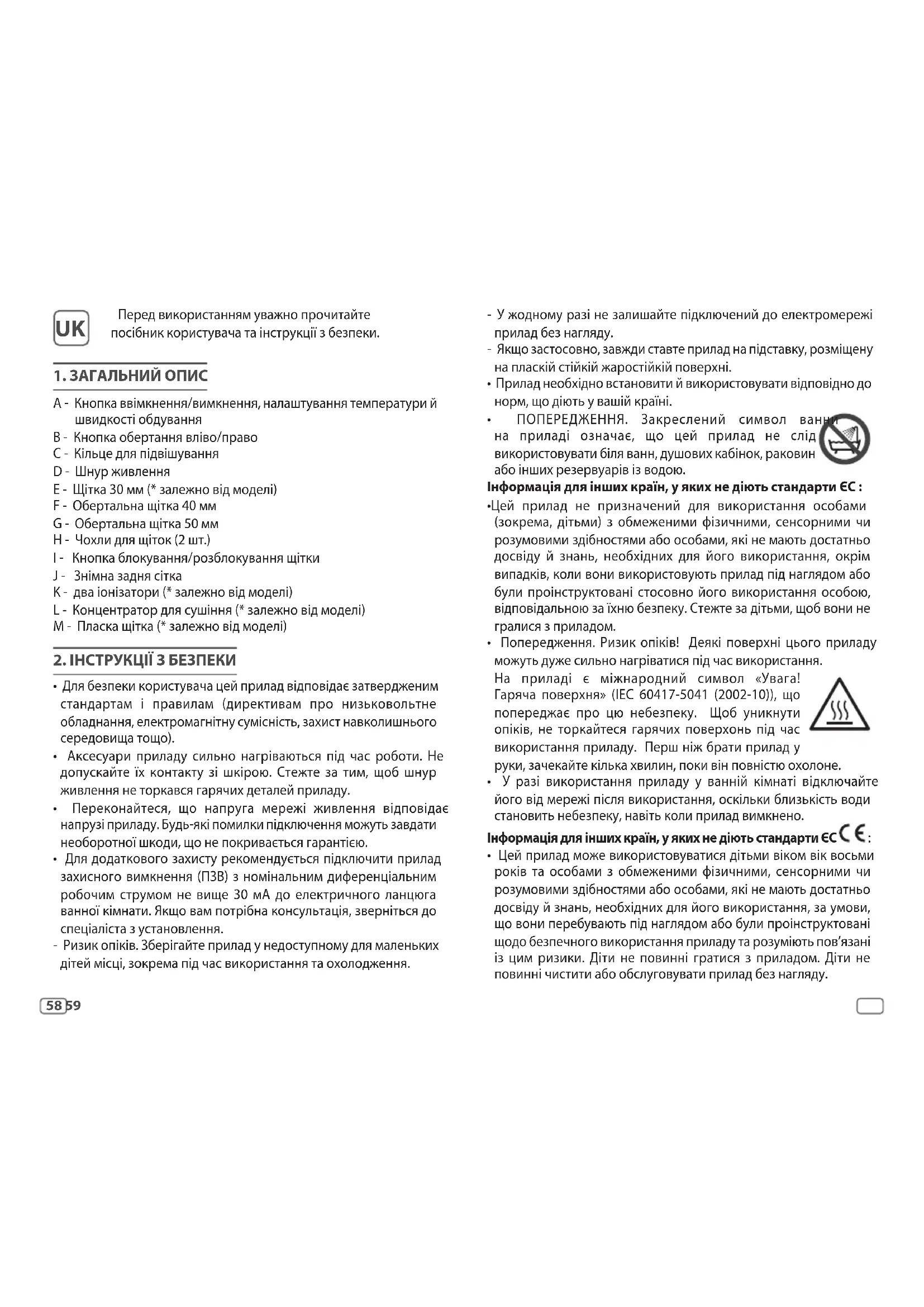 A - Кнопка ввімкнення/вимкнення, налаштування температури й швидкості обдування B - Кнопка обертання вліво/право C - Кільце для підвішування D - Шнур живлення E - Щітка 30 мм (* залежно від моделі) F - Обертальна щітка 40 мм G - Обертальна щітка 50 мм H - Чохли для щіток (2 шт.) I - Кнопка блокування/розблокування щітки J - Знімна задня сітка K - два іонізатори (* залежно від моделі) L - Концентратор для сушіння (* залежно від моделі) M - Пласка щітка (* залежно від моделі)