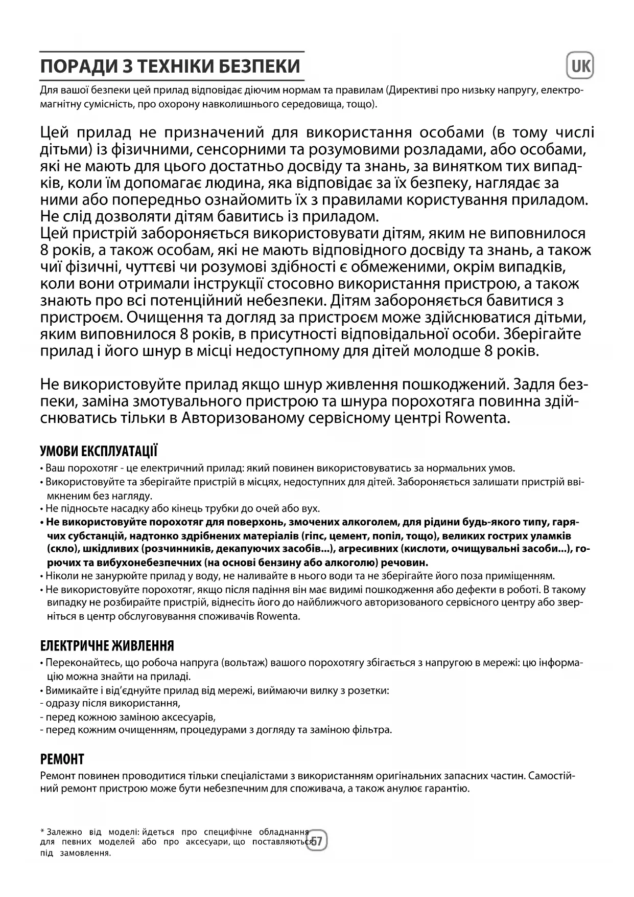 - В зависимости от модели: речь идет о специфической комплекта- ции некоторых моделей или об аксессуарах, поставляемых под заказ. RO_ASPIRATEUR_CITY_SPACE_903359_903359/01 12/06/13 15:34 Page5657 ПОРАДИ З ТЕХНІКИ БЕЗПЕКИ Для вашої безпеки цей прилад відповідає діючим нормам та правилам (Директиві про низьку напругу, електро- магнітну сумісність, про охорону навколишнього середовища, тощо). Цей прилад не призначений для використання особами (в тому числі дітьми) із фізичними, сенсорними та розумовими розладами, або особами, які не мають для цього достатньо досвіду та знань, за винятком тих випад- ків, коли їм допомагає людина, яка відповідає за їх безпеку, наглядає за ними або попередньо ознайомить їх з правилами користування приладом. Не слід дозволяти дітям бавитись із приладом. Цей пристрій забороняється використовувати дітям, яким не виповнилося 8 років, а також особам, які не мають відповідного досвіду та знань, а також чиї фізичні, чуттєві чи розумові здібності є обмеженими, окрім випадків, коли вони отримали інструкції стосовно використання пристрою, а також знають про всі потенційний небезпеки. Дітям забороняється бавитися з пристроєм. Очищення та догляд за пристроєм може здійснюватися дітьми, яким виповнилося 8 років, в присутності відповідальної особи. Зберігайте прилад і його шнур в місці недоступному для дітей молодше 8 років. Не використовуйте прилад якщо шнур живлення пошкоджений. Задля без- пеки, заміна змотувального пристрою та шнура порохотяга повинна здій- снюватись тільки в Авторизованому сервісному центрі Rowenta. УМОВИ ЕКСПЛУАТАЦІЇ