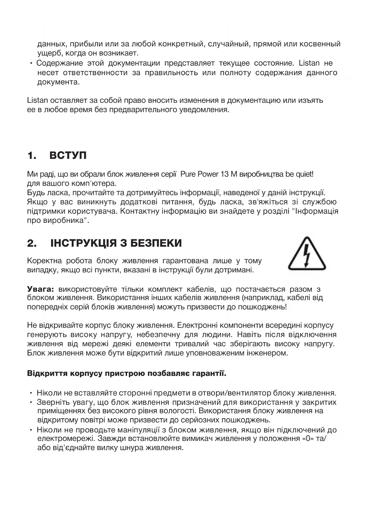 Вам не дозволяється відтворювати, розкривати зміст, публікувати чи зберігати вміст цього документа або витяг з нього без попередньої письмової згоди Listan be quiet! є зареєстрованим товарним знаком Listan GmbH Інші продукти та назви компаній, згадані у цій інструкції, можуть бути марками або зареєстрованими торговими марками відповідних власників Відповідно до політики компанії, вся продукція Listan піддається постійному удосконаленню та розвитку Listan залишає за собою право вносити будь-які зміни та вдосконалення у будь-який продукт, описаний у цьому документі, без попередження За жодних обставин Listan не несе відповідальності за втрати даних, прибутку або будь-які конкретні, випадкові, прямі або непрямі збитки у разі їх настання Зміст цієї документації представляє поточний стан справ Listan не несе відповідальності за правильність чи повноту змісту цього документа Listan залишає за собою право вносити зміни до документації або вилучити її у будь-який час без попереднього повідомлення Limited Warranty Per the terms and conditions of this limited warranty as given below, be quiet! warrants its new products to be free of defects resulting from faulty materials and faulty manufacturing for the length of the warranty period
