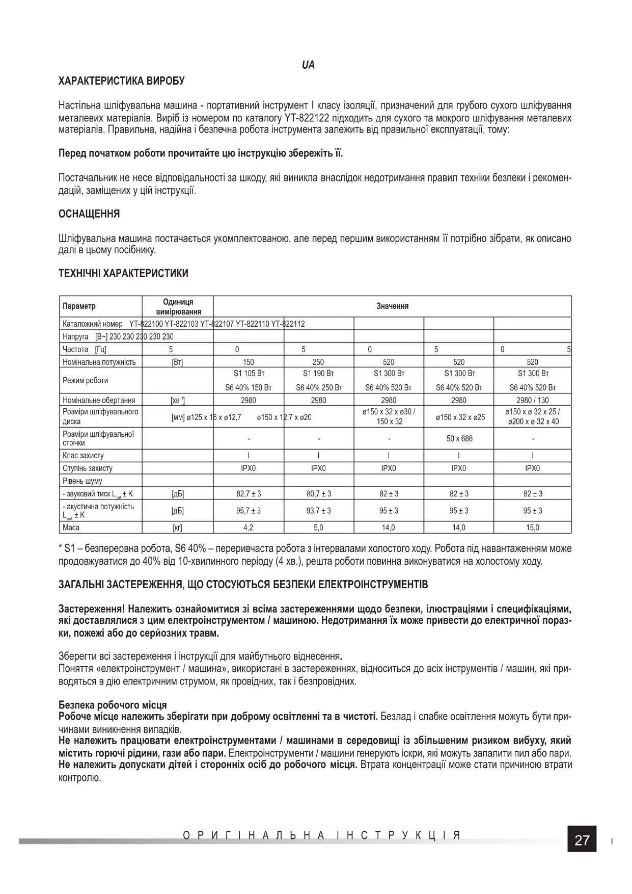 ХАРАКТЕРИСТИКА ВИРОБУ Настільна шліфувальна машина - портативний інструмент I класу ізоляції, призначений для грубого сухого шліфування металевих матеріалів. Виріб із номером по каталогу YT-822122 підходить для сухого та мокрого шліфування металевих матеріалів. Правильна, надійна і безпечна робота інструмента залежить від правильної експлуатації, тому: Перед початком роботи прочитайте цю інструкцію збережіть її. Постачальник не несе відповідальності за шкоду, які виникла внаслідок недотримання правил техніки безпеки і рекомен- дацій, заміщених у цій інструкції.