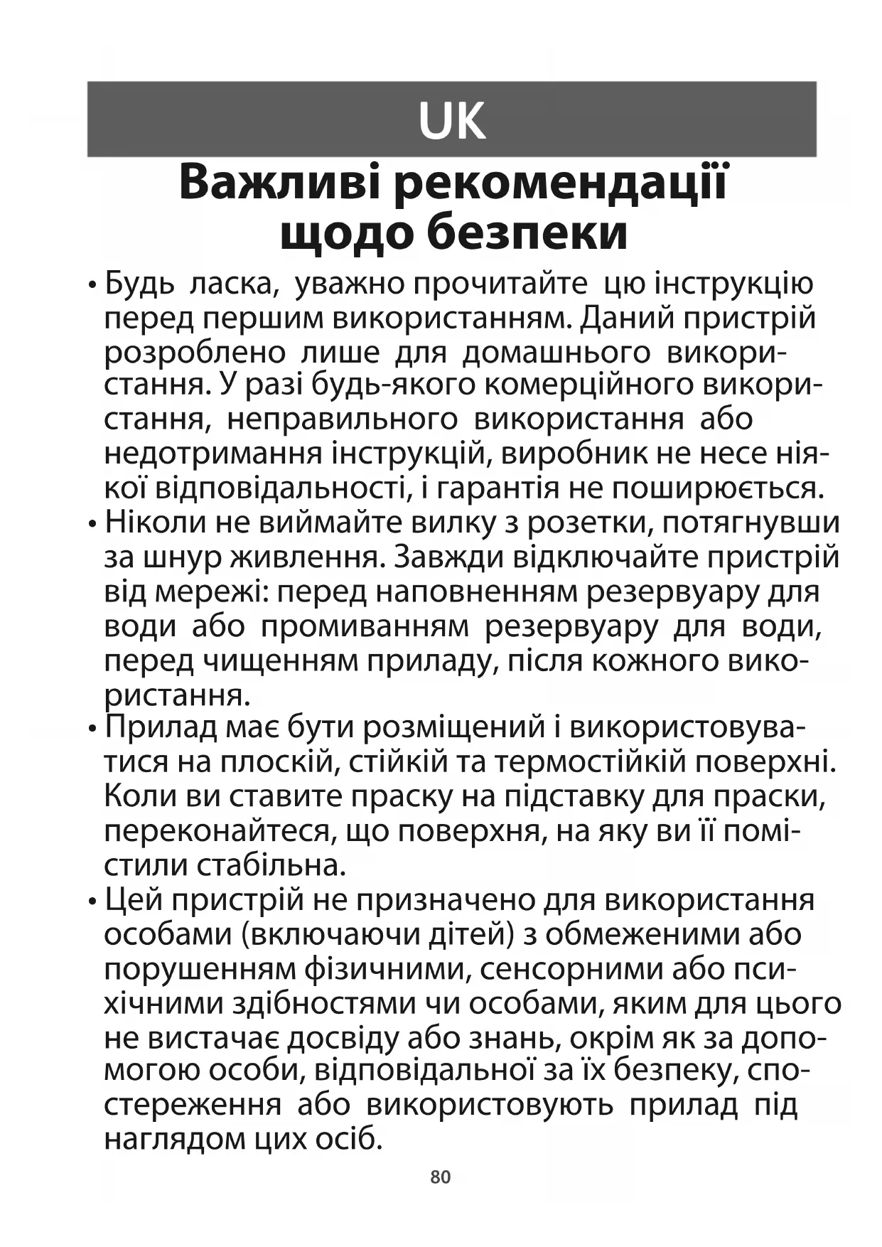 - Будь ласка, уважно прочитайте цю інструкцію перед першим використанням. Даний пристрій розроблено лише для домашнього викори- стання. У разі будь-якого комерційного викори- стання, неправильного використання або недотримання інструкцій, виробник не несе нія- кої відповідальності, і гарантія не поширюється.