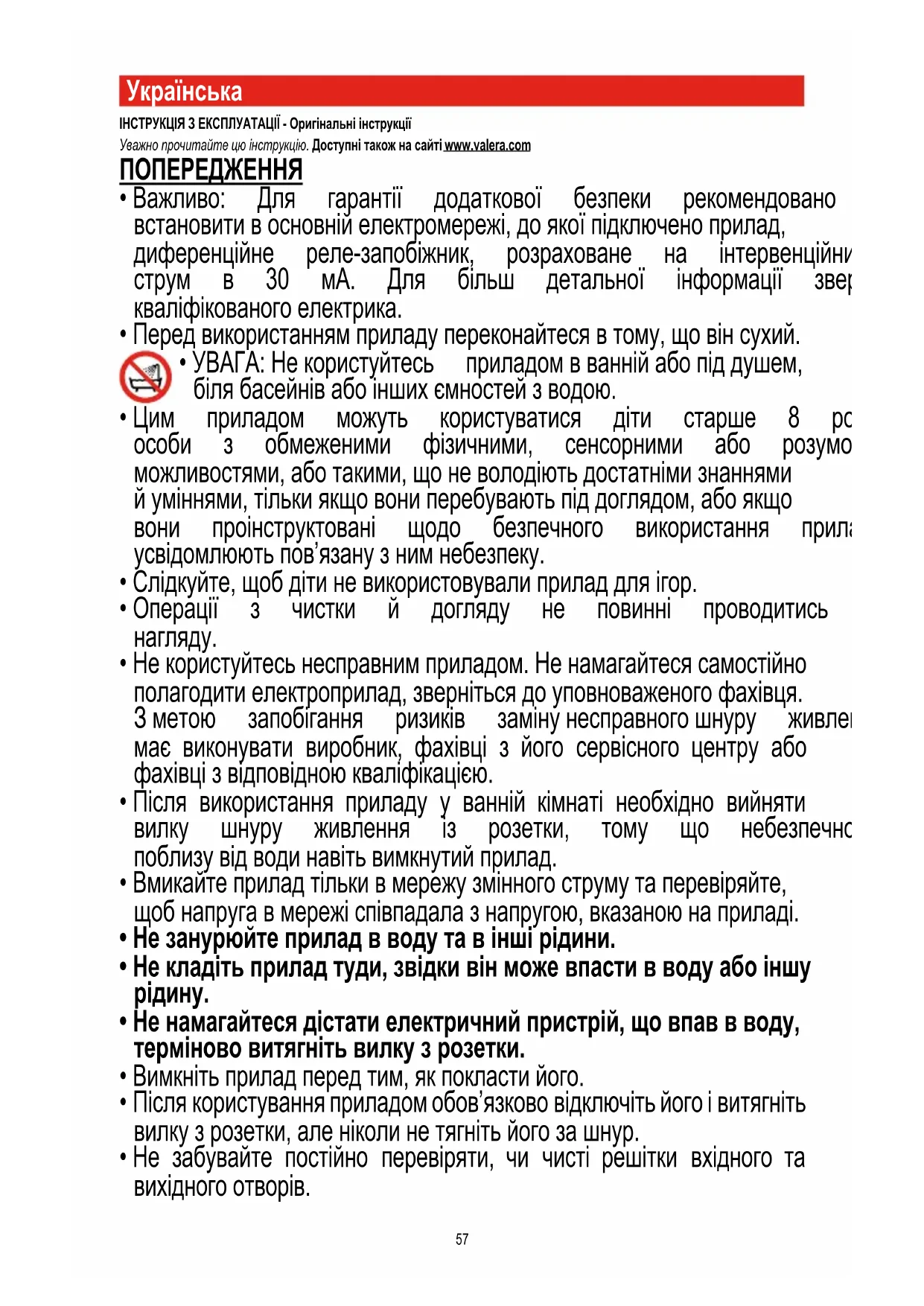 VALERA tescilli bir LIGO PATENTS SA - İsviçre markasıdır.57 Українськa ІНСТРУКЦІЯ З ЕКСПЛУАТАЦІЇ - Оригінальні інструкції Уважно прочитайте цю інструкцію. Доступні також на сайті www.valera.com ПОПЕРЕДЖЕННЯ