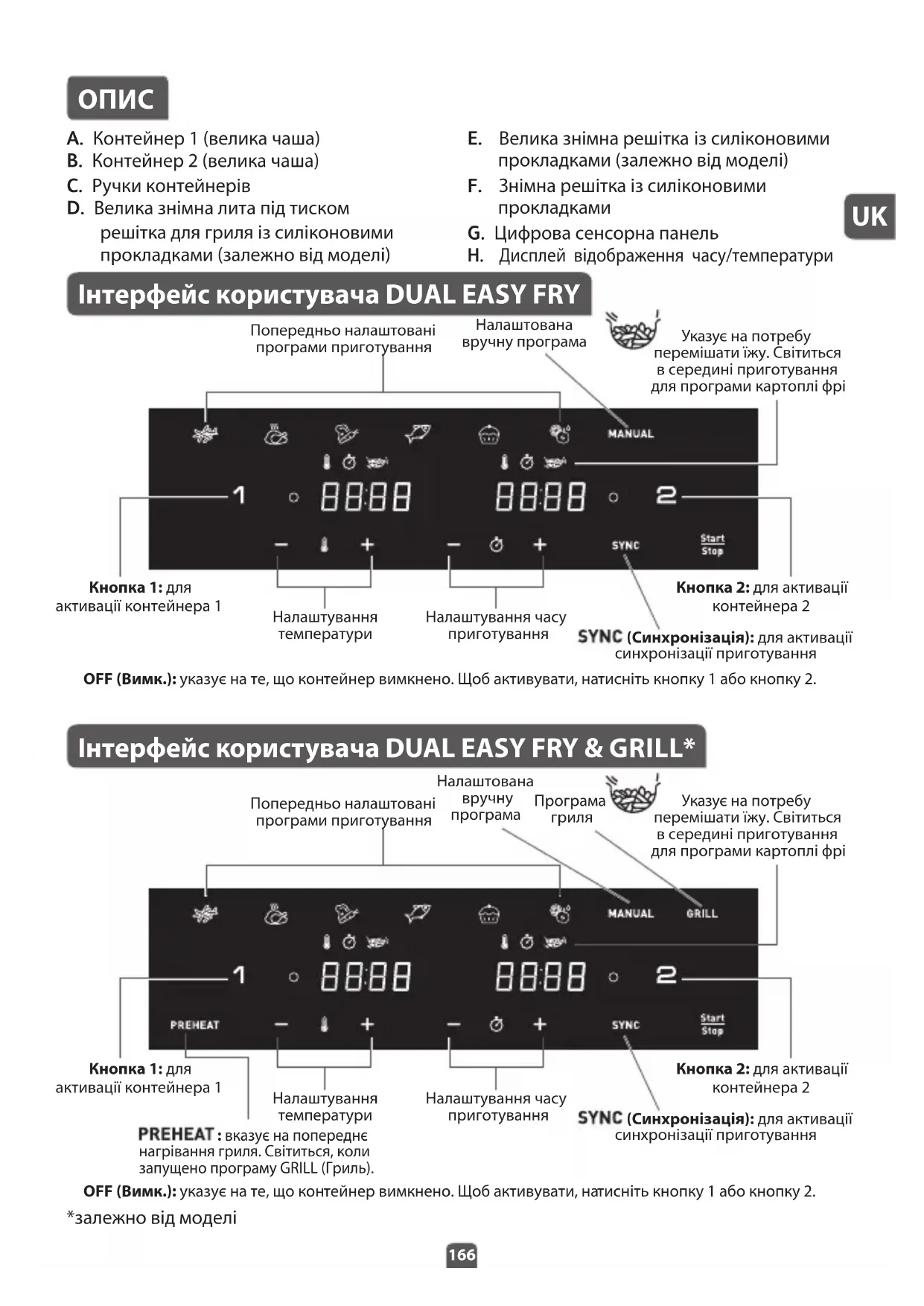 A. Контейнер1 (велика чаша) B. Контейнер2 (велика чаша) C. Ручки контейнерів D. Велика знімна лита під тиском решітка для гриля із силіконовими прокладками (залежно від моделі) E. Велика знімна решітка із силіконовими прокладками (залежно від моделі) F. Знімна решітка із силіконовими прокладками G. Цифрова сенсорна панель H. Дисплей відображення часу/температури Інтерфейс користувача DUAL EASY FRY Інтерфейс користувача DUAL EASY FRY & GRILL* OFF (Вимк.): указує на те, що контейнер вимкнено. Щоб активувати, натисніть кнопку1 або кнопку2. : вказує на попереднє нагрівання гриля. Світиться, коли запущено програму GRILL (Гриль). *залежно від моделі Попередньо налаштовані програми приготування Указує на потребу перемішати їжу. Світиться в середині приготування для програми картоплі фрі Налаштована вручну програма (Синхронізація): для активації синхронізації приготування Налаштування температури Налаштування часу приготування Кнопка1: для активації контейнера1 Кнопка2: для активації контейнера2 Указує на потребу перемішати їжу. Світиться в середині приготування для програми картоплі фрі Налаштована