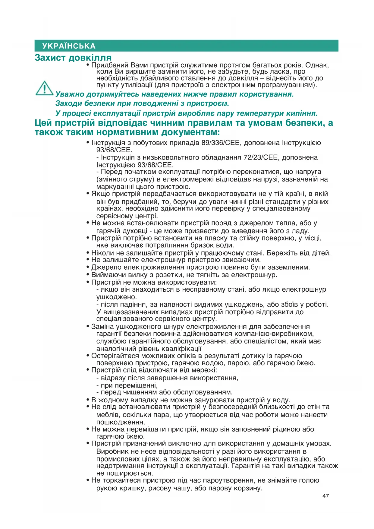 - Придбаний Вами пристрій служитиме протягом багатьох років. Однак, коли Ви вирішите замінити його, не забудьте, будь ласка, про необхідність дбайливого ставлення до довкілля – віднесіть його до пункту утилізації (для пристроїв з електронним програмуванням). Уважно дотримуйтесь наведених нижче правил користування. Заходи безпеки при поводженні з пристроєм. У процесі експлуатації пристрій виробляє пару температури кипіння. Цей пристрій відповідає чинним правилам та умовам безпеки, а також таким нормативним документам: