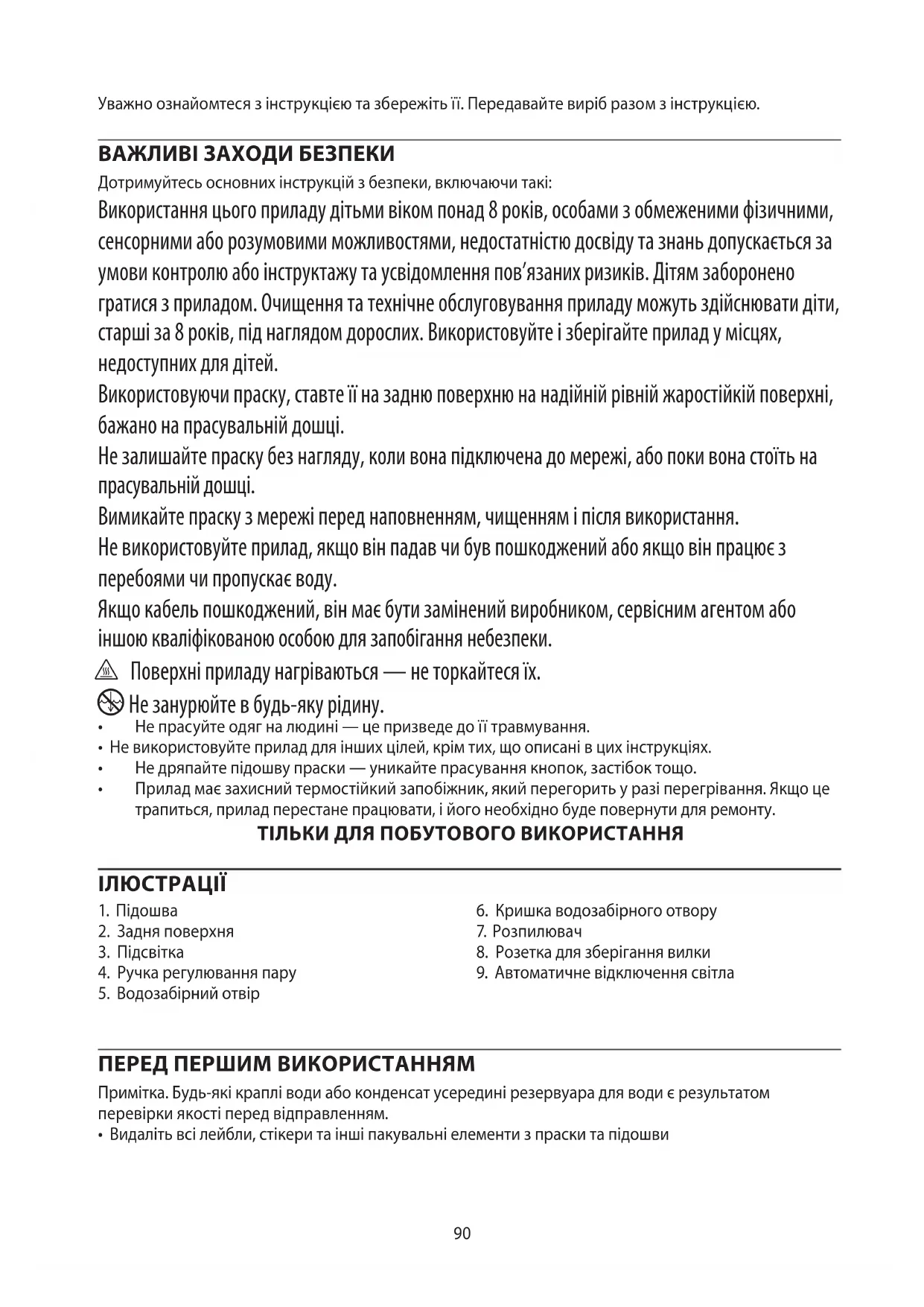 AE90 Уважно ознайомтеся з інструкцією та збережіть її. Передавайте виріб разом з інструкцією. ВАЖЛИВІ ЗАХОДИ БЕЗПЕКИ Дотримуйтесь основних інструкцій з безпеки, включаючи такі: Використання цього приладу дітьми віком понад 8 років, особами з обмеженими фізичними, сенсорними або розумовими можливостями, недостатністю досвіду та знань допускається за умови контролю або інструктажу та усвідомлення пов’язаних ризиків. Дітям заборонено гратися з приладом. Очищення та технічне обслуговування приладу можуть здійснювати діти, старші за 8 років, під наглядом дорослих. Використовуйте і зберігайте прилад у місцях, недоступних для дітей. Використовуючи праску, ставте її на задню поверхню на надійній рівній жаростійкій поверхні, бажано на прасувальній дошці. Не залишайте праску без нагляду, коли вона підключена до мережі, або поки вона стоїть на прасувальній дошці. Вимикайте праску з мережі перед наповненням, чищенням і після використання. Не використовуйте прилад, якщо він падав чи був пошкоджений або якщо він працює з перебоями чи пропускає воду. Якщо кабель пошкоджений, він має бути замінений виробником, сервісним агентом або іншою кваліфікованою особою для запобігання небезпеки.