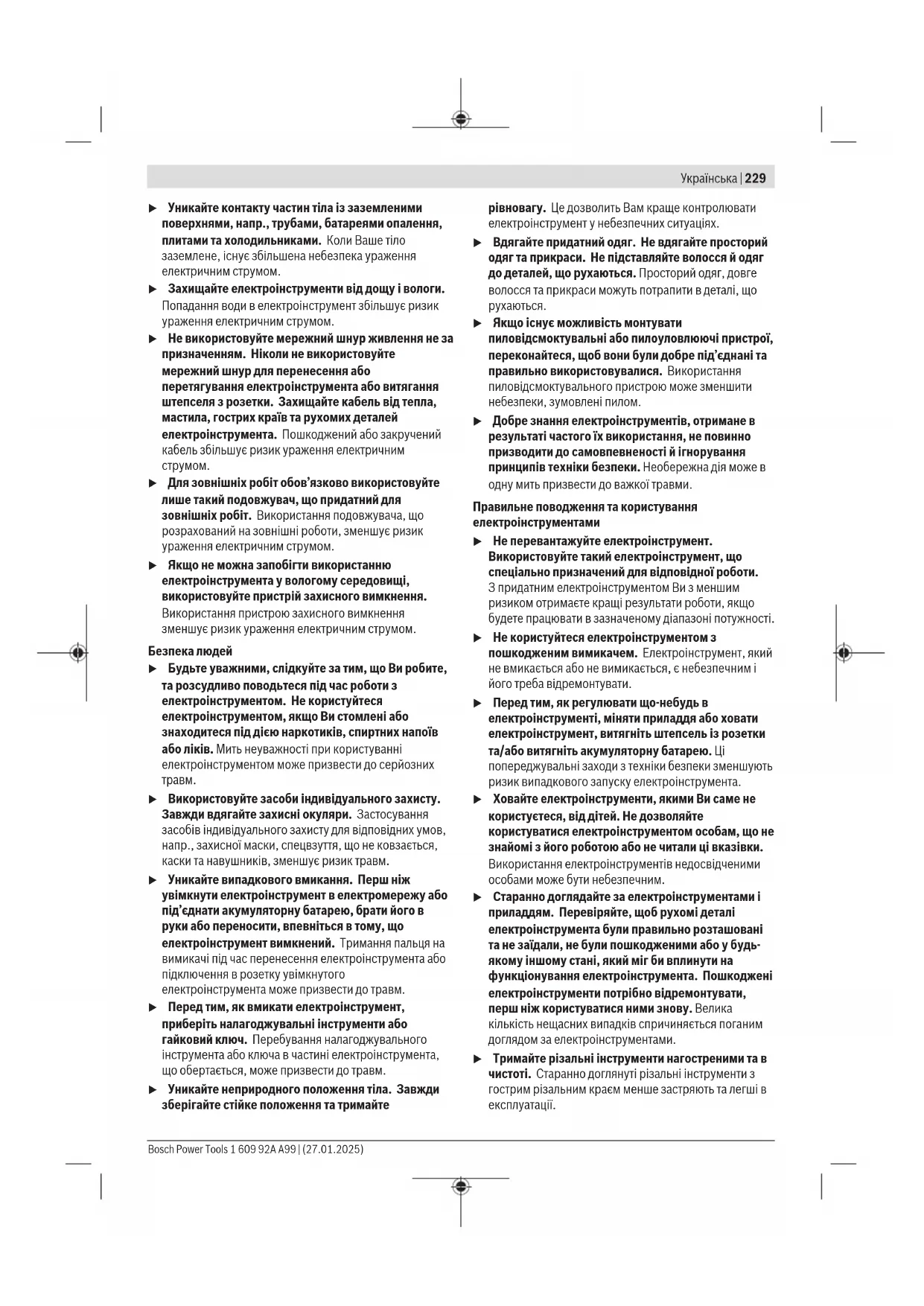 u Якщо існує можливість монтувати пиловідсмоктувальні або пилоуловлюючі пристрої, переконайтеся, щоб вони були добре під’єднані та правильно використовувалися. Використання пиловідсмоктувального пристрою може зменшити небезпеки, зумовлені пилом. u Добре знання електроінструментів, отримане в результаті частого їх використання, не повинно призводити до самовпевненості й ігнорування принципів техніки безпеки. Необережна дія може в одну мить призвести до важкої травми. Правильне поводження та користування електроінструментами u Не перевантажуйте електроінструмент. Використовуйте такий електроінструмент, що спеціально призначений для відповідної роботи. Зпридатним електроінструментом Ви з меншим ризиком отримаєте кращі результати роботи, якщо будете працювати в зазначеному діапазоні потужності. u Не користуйтеся електроінструментом з пошкодженим вимикачем. Електроінструмент, який не вмикається або не вимикається, є небезпечним і його треба відремонтувати. u Перед тим, як регулювати що-небудь в електроінструменті, міняти приладдя або ховати електроінструмент, витягніть штепсель із розетки та/або витягніть акумуляторну батарею. Ці попереджувальні заходи з техніки безпеки зменшують ризик випадкового запуску електроінструмента. u Ховайте електроінструменти, якими Ви саме не користуєтеся, від дітей. Не дозволяйте користуватися електроінструментом особам, що не знайомі з його роботою або не читали ці вказівки. Використання електроінструментів недосвідченими особами може бути небезпечним. u Старанно доглядайте за електроінструментами і приладдям. Перевіряйте, щоб рухомі деталі електроінструмента були правильно розташовані та не заїдали, не були пошкодженими або у будь- якому іншому стані, який міг би вплинути на функціонування електроінструмента. Пошкоджені електроінструменти потрібно відремонтувати, перш ніж користуватися ними знову. Велика кількість нещасних випадків спричиняється поганим доглядом за електроінструментами. u Тримайте різальні інструменти нагостреними та в чистоті. Старанно доглянуті різальні інструменти з гострим різальним краєм менше застряють та легші в експлуатації. Bosch Power Tools 1 609 92A A99 | (27.01.2025)230 | Українська u Використовуйте електроінструмент, приладдя до нього, робочі інструменти тощо відповідно до цих вказівок. Беріть до уваги при цьому умови роботи та специфіку виконуваної роботи. Використання електроінструментів для робіт, для яких вони не передбачені, може призвести до небезпечних
