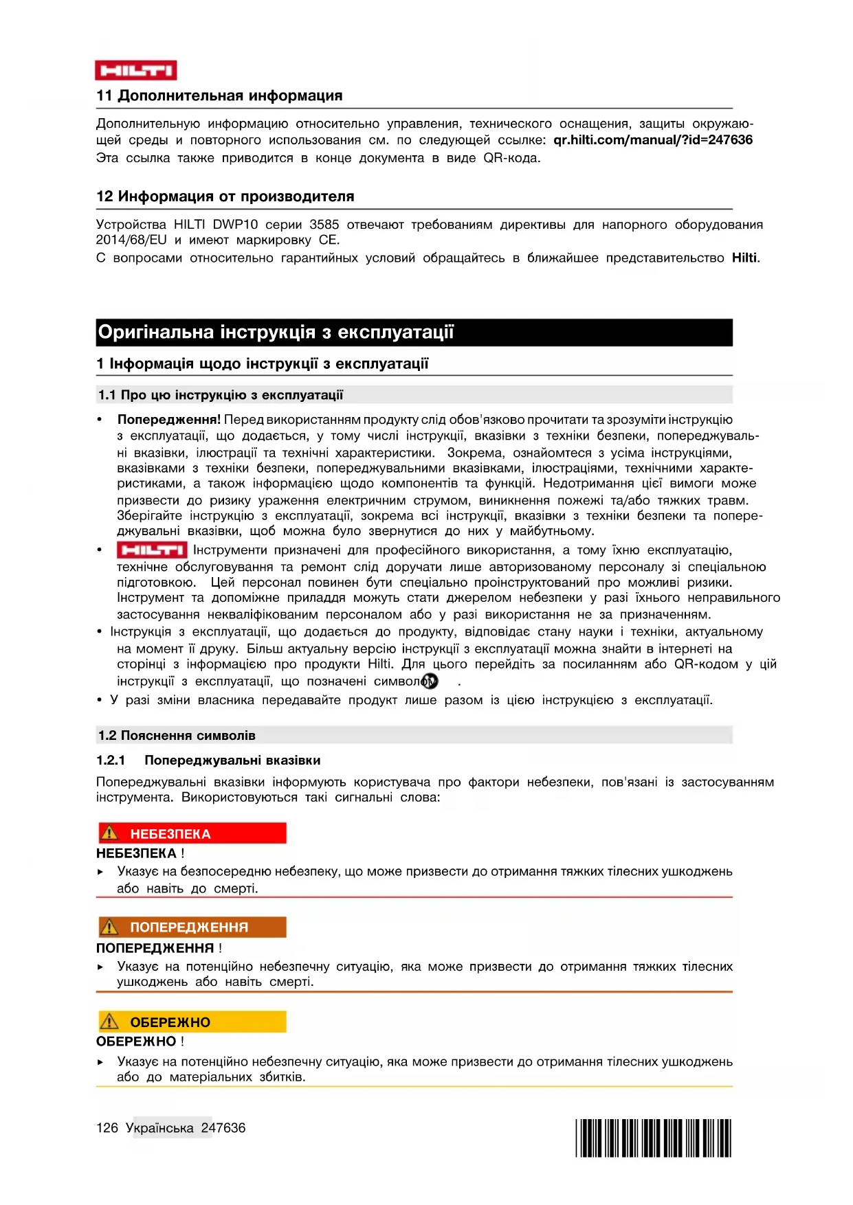 ▶ Прочистьте диск клапана або передайте інструмент до сервісної служби компанії Hilti для здійснення ремонту. Запобіжний клапан спрацьо- вує занадто рано Запобіжний клапан несправний ▶ Передайте інструмент до сервісної служби компанії Hilti для здійснення ремонту. Манометр не відображає тиск усередині резервуара Манометр несправний ▶ Передайте інструмент до сервісної служби компанії Hilti для здійснення ремонту.132 Қазақ 247636 *247636* 9 Утилізація Не викидайте цей інструмент у бак для побутового сміття! Більшість матеріалів, із яких виготовлено інструменти компанії Hilti, придатні для вторинної переробки. Передумовою для їхньої вторинної переробки є належне сортування відходів за типом матеріалу. У ба- гатьох країнах світу компанія Hilti приймає старі інструменти для їхньої утилізації. Щоб отримати додат- кову інформацію, звертайтеся до сервісної служби компанії Hilti або до свого торгового консультанта. 10 Гарантійні зобов'язання виробника ▶ З питань гарантії, будь ласка, звертайтеся до найближчого партнера компанії Hilti. 11 Додаткова інформація Щоб ознайомитися із додатковою інформацією про застосування й технічне обслуговування інстру- мента, його вплив на навколишнє середовище, а також про його утилізацію, будь ласка, скористайтеся цим посиланням: qr.hilti.com/manual/?id=247636 Це посилання також наведене наприкінці документа у вигляді QR-коду. 12 Інформація від виробника Інструменти HILTI DWP10 серії 3585 відповідають вимогам директиви 2014/68/EU про обладнання, що працює під тиском, та мають маркування CE. Із питань гарантії, будь ласка, звертайтеся до найближчого партнера компанії Hilti. Түпнұсқа пайдалану бойынша нұсқаулық 1 Пайдалану бойынша нұсқаулық туралы мәліметтер
