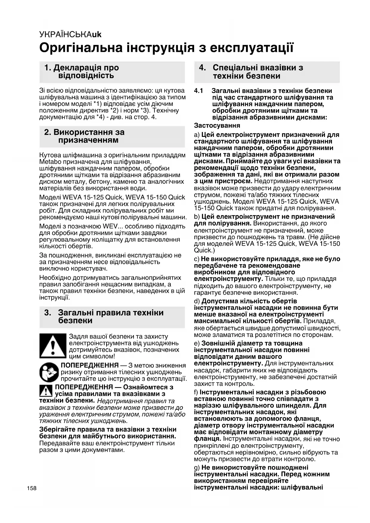 Оригінальна інструкція з експлуатації Зі всією відповідальністю заявляємо: ця кутова шліфувальна машина з ідентифікацією за типом і номером моделі *1) відповідає усім діючим положенням директив *2) і норм *3). Технічну документацію для *4) - див. на стор. 4. Кутова шліфмашина з оригінальним приладдям Metabo призначена для шліфування, шліфування наждачним папером, обробки дротяними щітками та відрізання абразивним диском металу, бетону, каменю та аналогічних матеріалів без використання води. Моделі WEVA 15-125 Quick, WEVA 15-150 Quick також призначені для легких полірувальних робіт. Для складних полірувальних робіт ми рекомендуємо наші кутові полірувальні машини. Моделі з позначкою WEV... особливо підходять для обробки дротяними щітками завдяки регулювальному коліщатку для встановлення кількості обертів. За пошкодження, викликані експлуатацією не за призначенням несе відповідальність виключно користувач. Необхідно дотримуватись загальноприйнятих правил запобігання нещасним випадкам, а також правил техніки безпеки, наведених в цій інструкції. Задля вашої безпеки та захисту електроінструмента від ушкоджень дотримуйтесь вказівок, позначених цим символом! ПОПЕРЕДЖЕННЯ — З метою зниження ризику отримання тілесних ушкоджень прочитайте цю інструкцію з експлуатації. ПОПЕРЕДЖЕННЯ — Ознайомтеся з усіма правилами та вказівками з техніки безпеки. Недотримання правил та вказівок з техніки безпеки може призвести до ураження електричним струмом, пожежі та/або тяжких тілесних ушкоджень. Зберігайте правила та вказівки з техніки безпеки для майбутнього використання. Передавайте ваш електроінструмент тільки разом з цими документами.