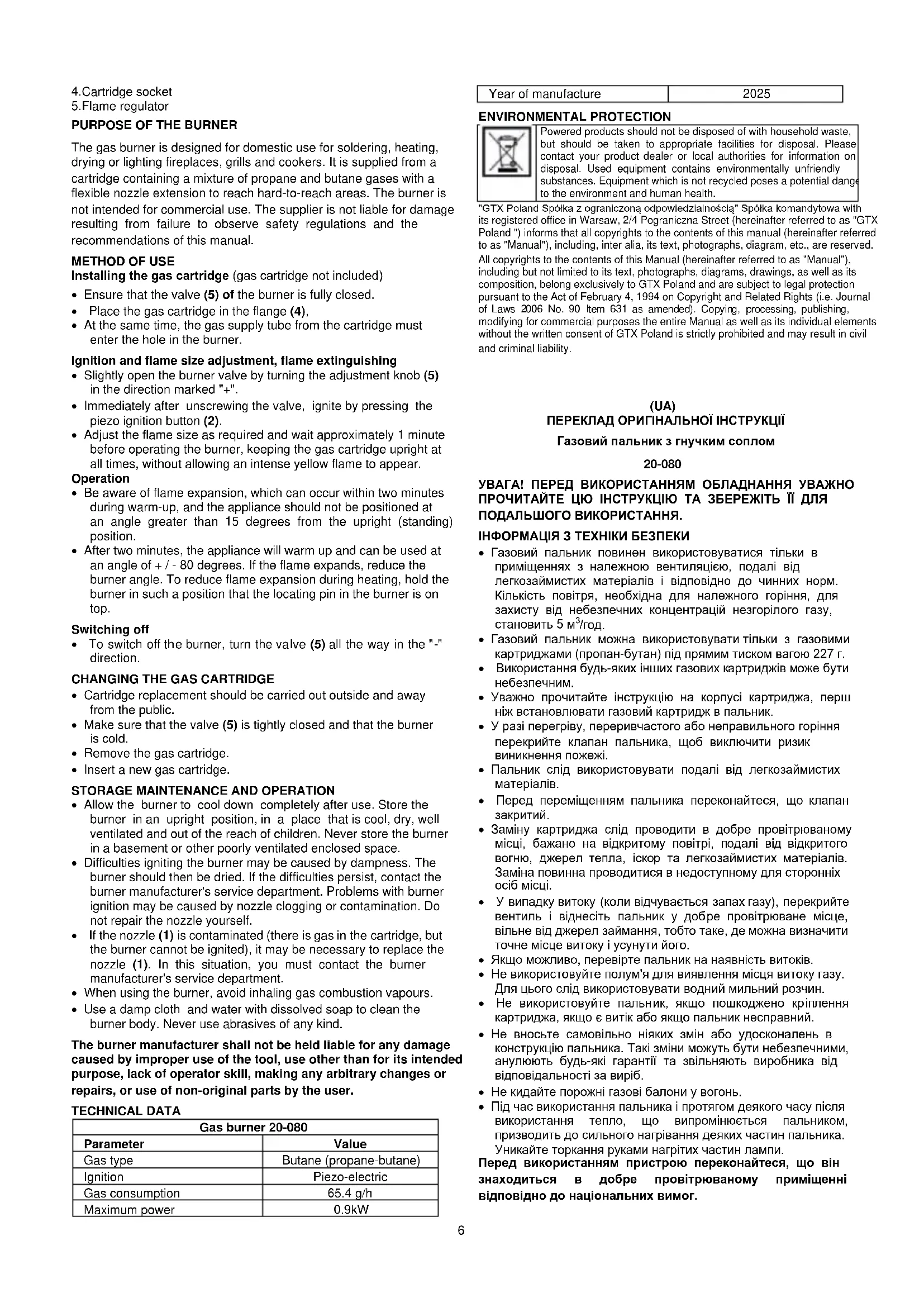 (UA) ПЕРЕКЛАД ОРИГІНАЛЬНОЇ ІНСТРУКЦІЇ Газовий пальник з гнучким соплом 20-080 УВАГА! ПЕРЕД ВИКОРИСТАННЯМ ОБЛАДНАННЯ УВАЖНО ПРОЧИТАЙТЕ ЦЮ ІНСТРУКЦІЮ ТА ЗБЕРЕЖІТЬ ЇЇ ДЛЯ ПОДАЛЬШОГО ВИКОРИСТАННЯ. ІНФОРМАЦІЯ З ТЕХНІКИ БЕЗПЕКИ