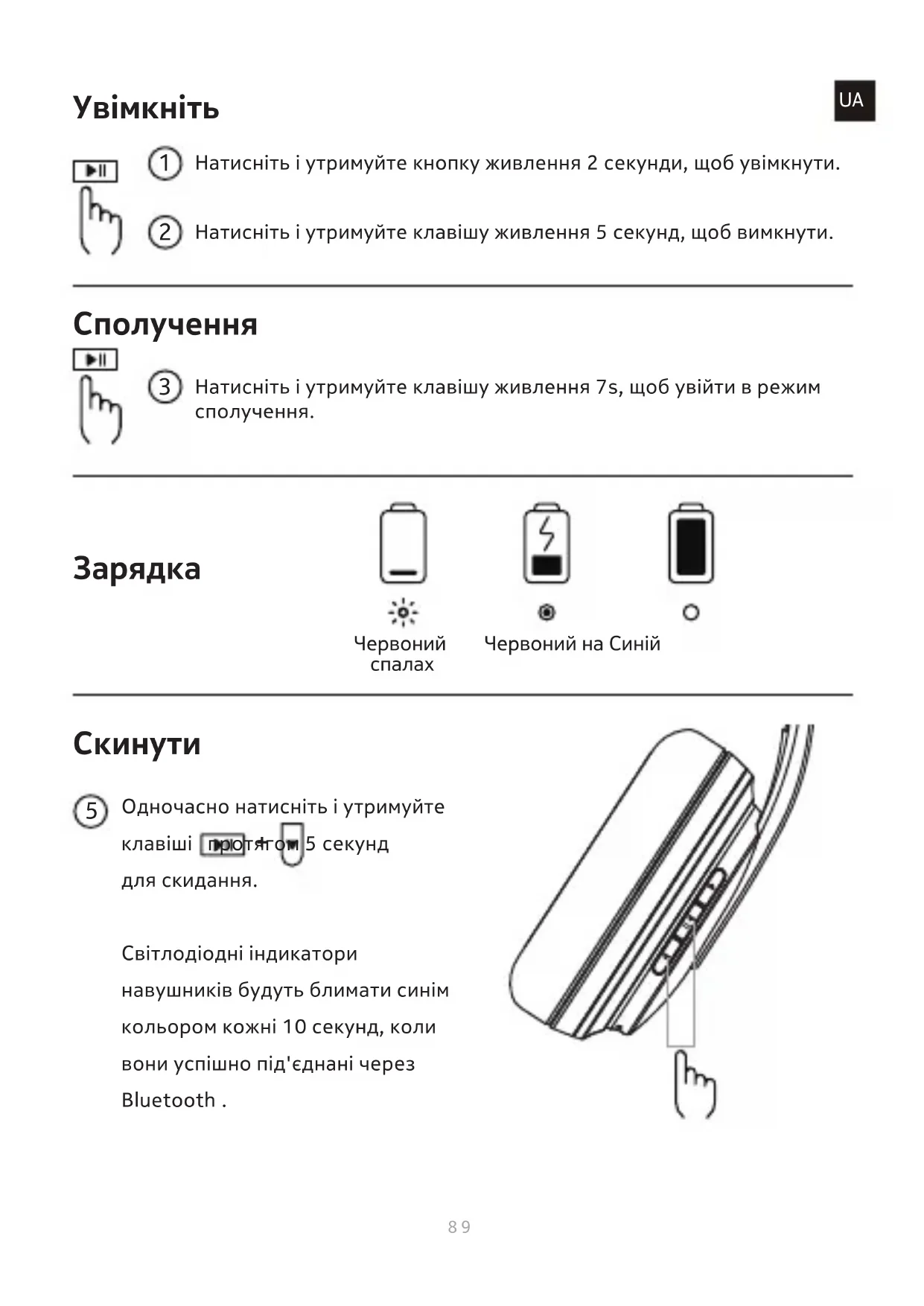 Світлодіодні індикатори навушників будуть блимати синім кольором кожні 10 секунд, коли вони успішно під'єднані через Bluetooth .