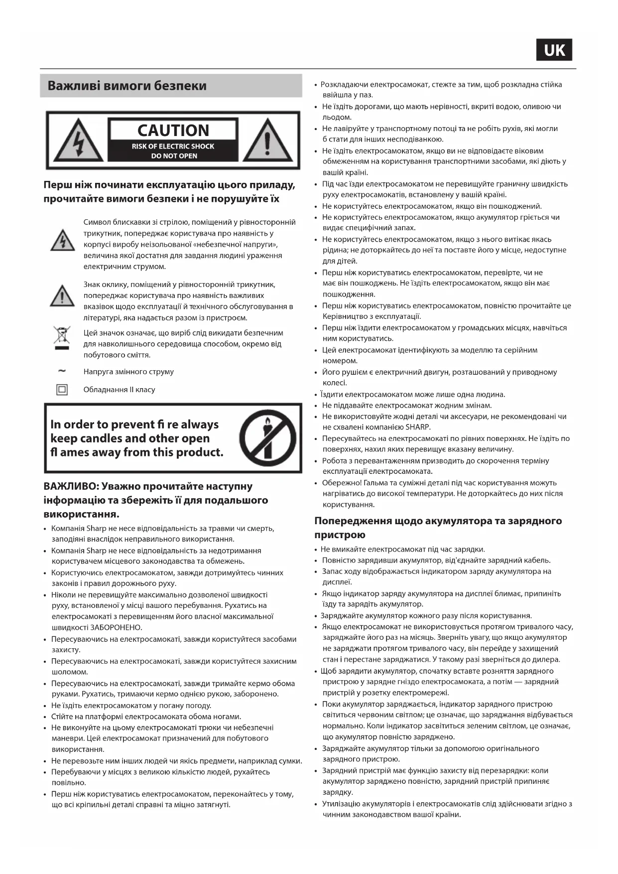 - Якщо вам заскладно виконувати якісь роботи з догляду й технічного обслуговування електросамоката, зверніться по пораду до дилера або до служби підтримки компанії SHARP.UK Вміст упаковки: