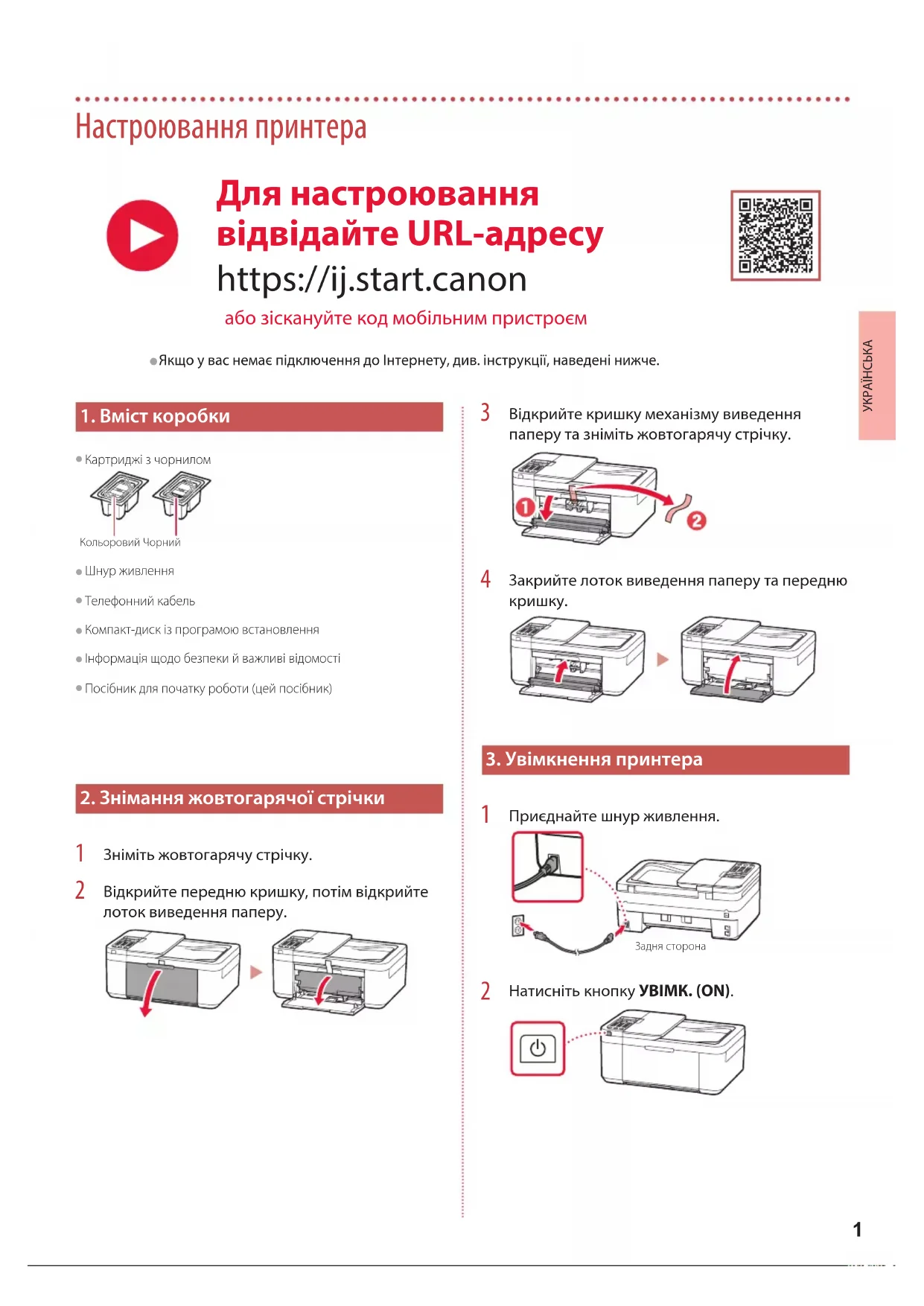 Натисніть кнопку УВІМК. (ON). Для настроювання відвідайте URL-адресу https://ij.start.canon або зіскануйте код мобільним пристроєм