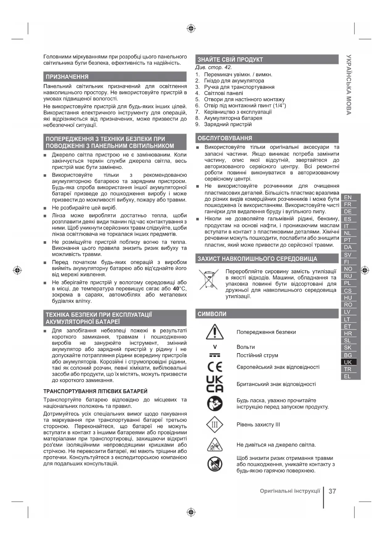 Превод от оригиналните инструкцииГоловними міркуваннями при розробці цього панельного світильника були безпека, ефективність та надійність. ПРИЗНАЧЕННЯ Панельний світильник призначений для освітлення навколишнього простору. Не використовуйте пристрій в умовах підвищеної вологості. Не використовуйте пристрій для будь-яких інших цілей. Використання електричного інструменту для операцій, які відрізняються від призначених, може призвести до небезпечної ситуації. ПОПЕРЕДЖЕННЯ З ТЕХНІКИ БЕЗПЕКИ ПРИ ПОВОДЖЕННІ З ПАНЕЛЬНИМ СВІТИЛЬНИКОМ ■ Джерело світла пристрою не є замінюваним. Коли закінчується термін служби джерела світла, весь пристрій має бути замінено. ■ Використовуйте тільки з рекомендованою акумуляторною батареєю та зарядним пристроєм. Будь-яка спроба використання іншої акумуляторної батареї призведе до пошкодження виробу і може призвести до можливості вибуху, пожару або травми. ■ Не розбирайте цей виріб. ■ Лінза може виробляти достатньо тепла, щоби розплавити деякі види тканин під час контактування з ними. Щоб уникнути серйозних травм слідкуйте, щоби лінза освітлювача не торкалася інших предметів. ■ Не розміщуйте пристрій поблизу вогню та тепла. Виконання цього правила знизить ризик вибуху та можливість травми. ■ Перед початком будь-яких операцій з виробом вийміть акумуляторну батарею або від'єднайте його від мережі живлення. ■ Не зберігайте пристрій у вологому середовищі або в місці, де температура перевищує сягає або 40°C, зокрема в сараях, автомобілях або металевих будівлях влітку. ТЕХНІКА БЕЗПЕКИ ПРИ ЕКСПЛУАТАЦІЇ АКУМУЛЯТОРНОЇ БАТАРЕЇ ■ Для запобігання небезпеці пожежі в результаті короткого замикання, травмам і пошкодженню виробів не занурюйте інструмент, змінний акумулятор або зарядний пристрій у рідину і не допускайте потрапляння рідини всередину пристроїв або акумуляторів. Корозійні і струмопровідні рідини, такі як солоний розчин, певні хімікати, вибілювальні засоби або продукти, що їх містять, можуть призвести