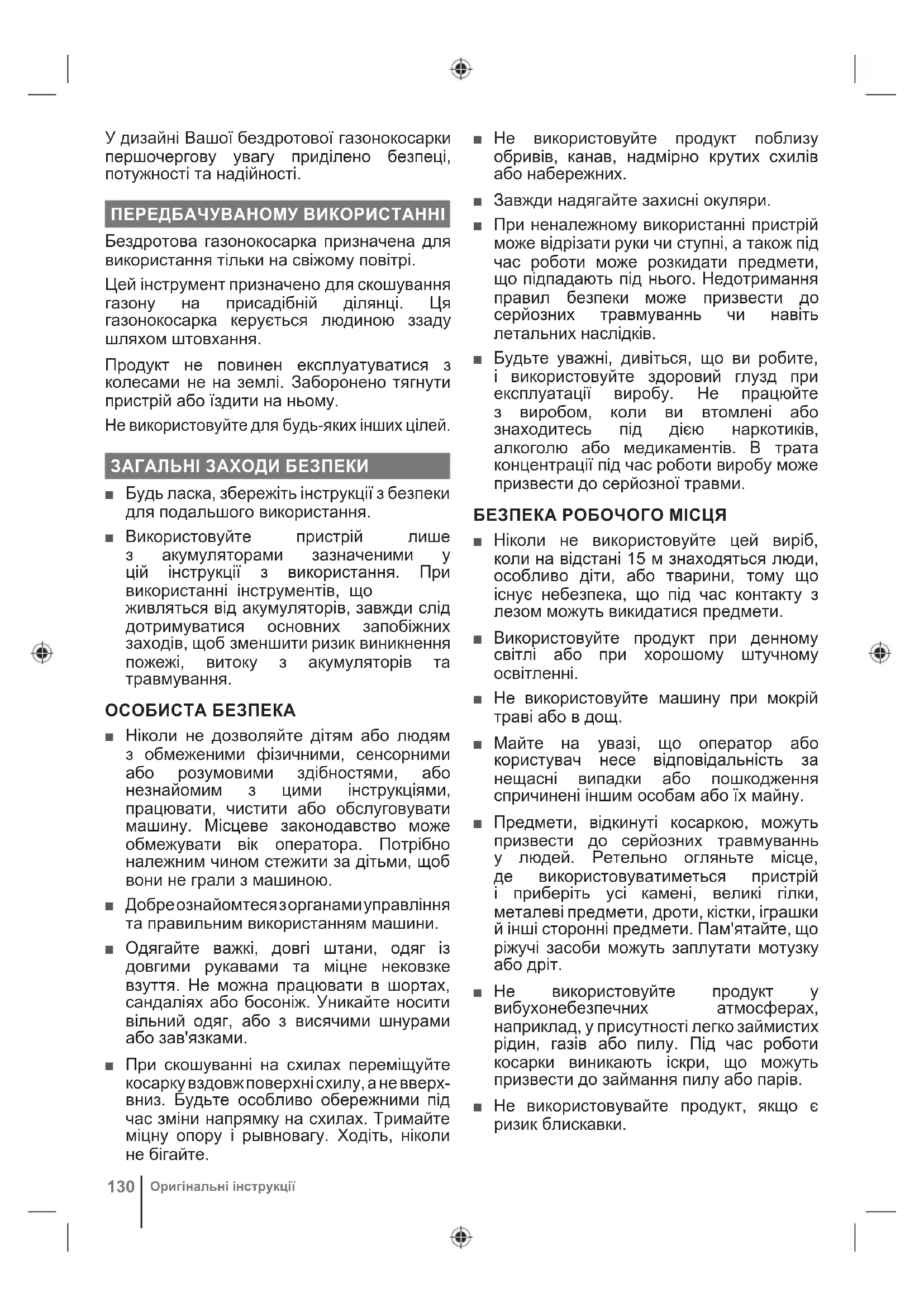Предупреждение130 Оригінальні інструкції У дизайні Вашої бездротової газонокосарки першочергову увагу приділено безпеці, потужності та надійності. ПЕРЕДБАЧУВАНОМУ ВИКОРИСТАННІ Бездротова газонокосарка призначена для використання тільки на свіжому повітрі. Цей інструмент призначено для скошування газону на присадібній ділянці. Ця газонокосарка керується людиною ззаду шляхом штовхання. Продукт не повинен експлуатуватися з колесами не на землі. Заборонено тягнути пристрій або їздити на ньому. Не використовуйте для будь-яких інших цілей. ЗАГАЛЬНІ ЗАХОДИ БЕЗПЕКИ ■ Будь ласка, збережіть інструкції з безпеки для подальшого використання. ■ Використовуйте пристрій лише з акумуляторами зазначеними у цій інструкції з використання. При використанні інструментів, що живляться від акумуляторів, завжди слід дотримуватися основних запобіжних заходів, щоб зменшити ризик виникнення пожежі, витоку з акумуляторів та травмування. ОСОБИСТА БЕЗПЕКА ■ Ніколи не дозволяйте дітям або людям з обмеженими фізичними, сенсорними або розумовими здібностями, або незнайомим з цими інструкціями, працювати, чистити або обслуговувати машину. Місцеве законодавство може обмежувати вік оператора. Потрібно належним чином стежити за дітьми, щоб вони не грали з машиною. ■ Добре ознайомтеся з органами управління та правильним використанням машини. ■ Одягайте важкі, довгі штани, одяг із довгими рукавами та міцне нековзке взуття. Не можна працювати в шортах, сандаліях або босоніж. Уникайте носити вільний одяг, або з висячими шнурами або зав'язками. ■ При скошуванні на схилах переміщуйте косарку вздовж поверхні схилу, а не вверх- вниз. Будьте особливо обережними під час зміни напрямку на схилах. Тримайте міцну опору і рывновагу. Ходіть, ніколи не бігайте. ■ Не використовуйте продукт поблизу обривів, канав, надмірно крутих схилів або набережних. ■ Завжди надягайте захисні окуляри. ■ При неналежному використанні пристрій може відрізати руки чи ступні, а також під час роботи може розкидати предмети, що підпадають під нього. Недотримання правил безпеки може призвести до серйозних травмуваннь чи навіть летальних наслідків. ■ Будьте уважні, дивіться, що ви робите, і використовуйте здоровий глузд при експлуатації виробу. Не працюйте з виробом, коли ви втомлені або знаходитесь під дією наркотиків, алкоголю або медикаментів. В трата концентрації під час роботи виробу може призвести до серйозної травми. БЕЗПЕКА РОБОЧОГО МІСЦЯ ■ Ніколи не використовуйте цей виріб, коли на відстані 15 м знаходяться люди, особливо діти, або тварини, тому що існує небезпека, що під час контакту з лезом можуть викидатися предмети. ■ Використовуйте продукт при денному світлі або при хорошому штучному освітленні. ■ Не використовуйте машину при мокрій траві або в дощ. ■ Майте на увазі, що оператор або користувач несе відповідальність за нещасні випадки або пошкодження спричинені іншим особам або їх майну. ■ Предмети, відкинуті косаркою, можуть призвести до серйозних травмуваннь у людей. Ретельно огляньте місце, де використовуватиметься пристрій і приберіть усі камені, великі гілки, металеві предмети, дроти, кістки, іграшки й інші сторонні предмети. Пам'ятайте, що ріжучі засоби можуть заплутати мотузку