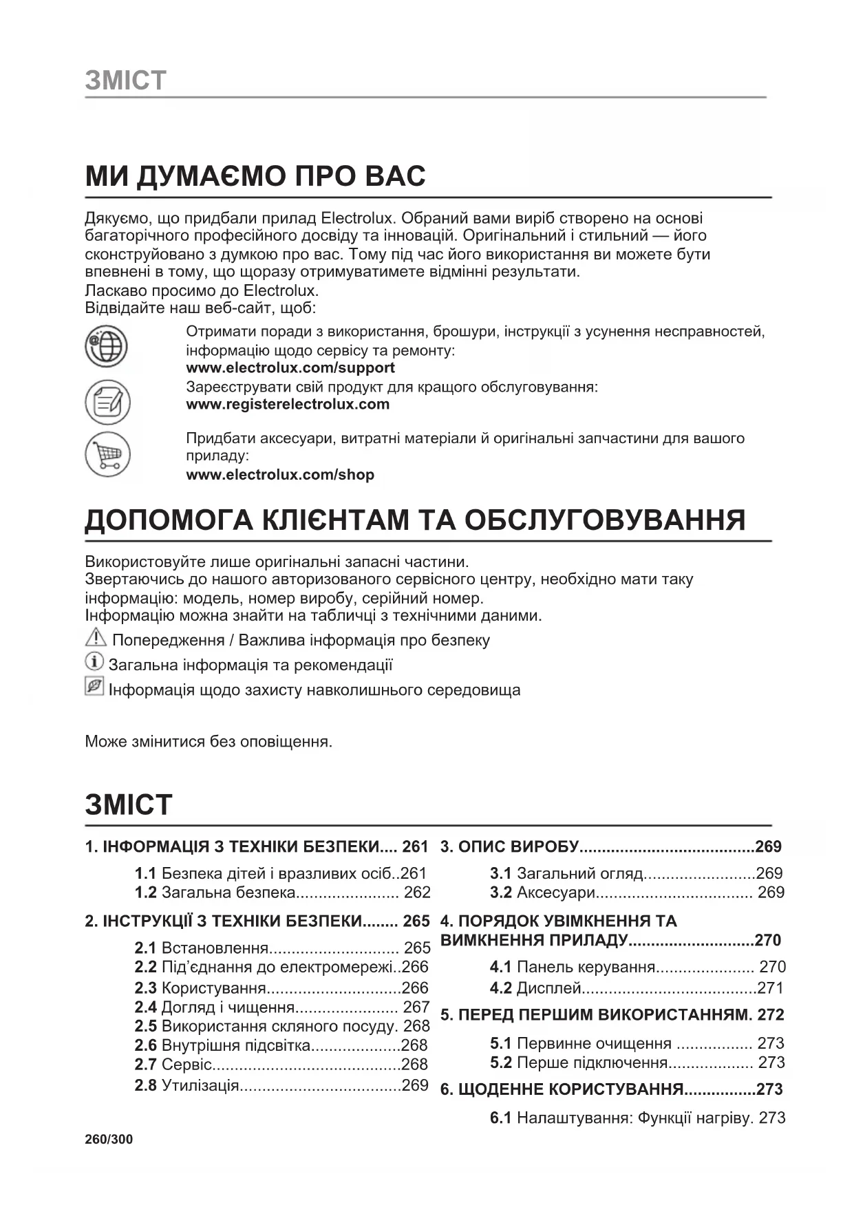 Материалы с символом следует сдавать на переработку. Положите упаковку в соответствующие контейнеры для сбора вторичного сырья. Принимая участие в переработке старого электробытового оборудования, Вы помогаете защитить окружающую среду и здоровье человека. Не выбрасывайте вместе с бытовыми отходами бытовую технику, помеченную символом . Прибор следует доставить в место раздельного накопления и сбора отходов потребления или в пункт сбора использованной бытовой техники для последующей утилизации. 259/300 ПРОБУЙТЕ!МИ ДУМАЄМО ПРО ВАС Дякуємо, що придбали прилад Electrolux. Обраний вами виріб створено на основі багаторічного професійного досвіду та інновацій. Оригінальний і стильний — його сконструйовано з думкою про вас. Тому під час його використання ви можете бути впевнені в тому, що щоразу отримуватимете відмінні результати. Ласкаво просимо до Electrolux. Відвідайте наш веб-сайт, щоб: Отримати поради з використання, брошури, інструкції з усунення несправностей, інформацію щодо сервісу та ремонту: www.electrolux.com/support Зареєструвати свій продукт для кращого обслуговування: www.registerelectrolux.com Придбати аксесуари, витратні матеріали й оригінальні запчастини для вашого