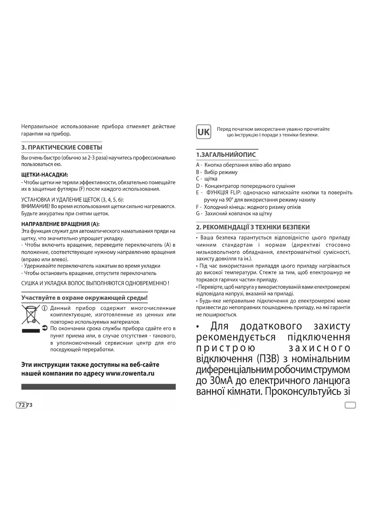 Для досконалого оволодіння технікою використання, як правило, необхідний деякий час (2-3 сеанси).НАСАДКИ:- Для зберігання високої якості щіток, кожного разу після користування ними, необхідно обов’язково покпасти їх до захисних чохлів (F).ВСТАНОВЛЕННЯ ТА ЗНІМАННЯ ЩІТОК З ПРИСТРОЮ (3, 4, 5, 6):ПАМ’ЯТКА. В процесі користування насадки дуже сильно нагріваються. Знімайте їх дуже обережно.НАПРЯМ ОБЕРТАННЯ (A):Ця функция дозволяє автоматично намотати пасмо волосся навколо щітки-для укладання без зусиль.-Щоб ввімкнути обертання, посуньте перемикач (A) у потрібному напрямку обертання (вправо або вліво).- Під час укладання тримайте перемикач натиснутим.- Для зупинки обертання відпустіть перемикач.ОДНОЧАСНЕ СУШІННЯ І НАДАННЯ ФОРМИ! ДБАЙМО ПРО ЗАХИСТ ДОВКІЛЛЯ! Ваш прилад містить багато матеріалів, які можуть бути перероблені або повторно використані.Після закінчення терміну служби приладу здайте його до пункту збору nобутових приладів, а за відсутності такого-до авторизованого сервісного центру для його подальшої обробки. Ці інструкції також доступні на нашому сайті www.rowenta.com. Lugege enne kasutamist tähelepanelikult läbi nii kasutusjuhend kui ka turvanõuded.