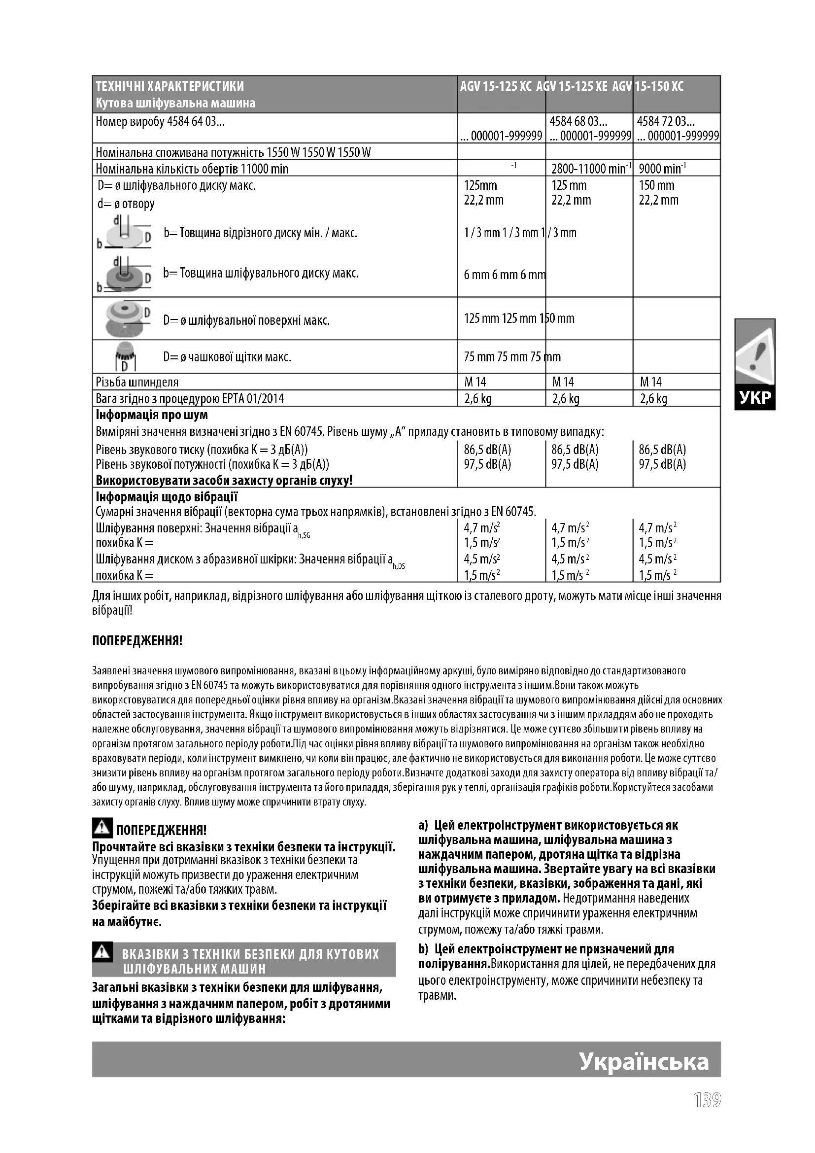 ТЕХНІЧНІ ХАРАКТЕРИСТИКИ Кутова шліфувальна машина AGV 15-125 XC AGV 15-125 XE AGV 15-150 XC Номер виробу 4584 64 03... ... 000001-999999