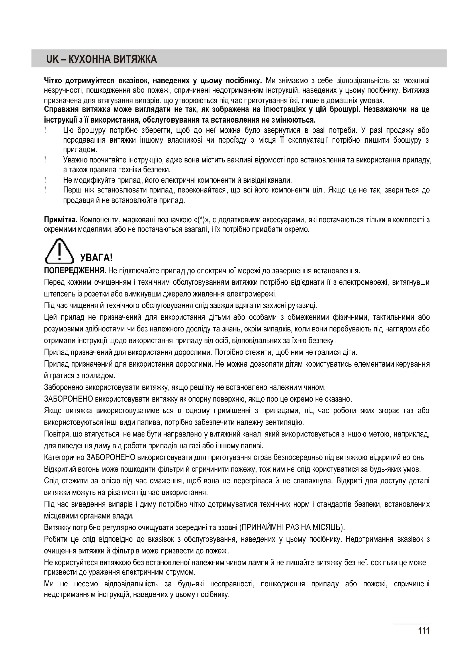 110Чітко дотримуйтеся вказівок, наведених у цьому посібнику. Ми знімаємо з себе відповідальність за можливі незручності, пошкодження або пожежі, спричинені недотриманням інструкцій, наведених у цьому посібнику. Витяжка призначена для втягування випарів, що утворюються під час приготування їжі, лише в домашніх умовах. Справжня витяжка може виглядати не так, як зображена на ілюстраціях у цій брошурі. Незважаючи на це інструкції з її використання, обслуговування та встановлення не змінюються. ! Цю брошуру потрібно зберегти, щоб до неї можна було звернутися в разі потреби. У разі продажу або передавання витяжки іншому власникові чи переїзду з місця її експлуата ції потрібно лишити брошуру з