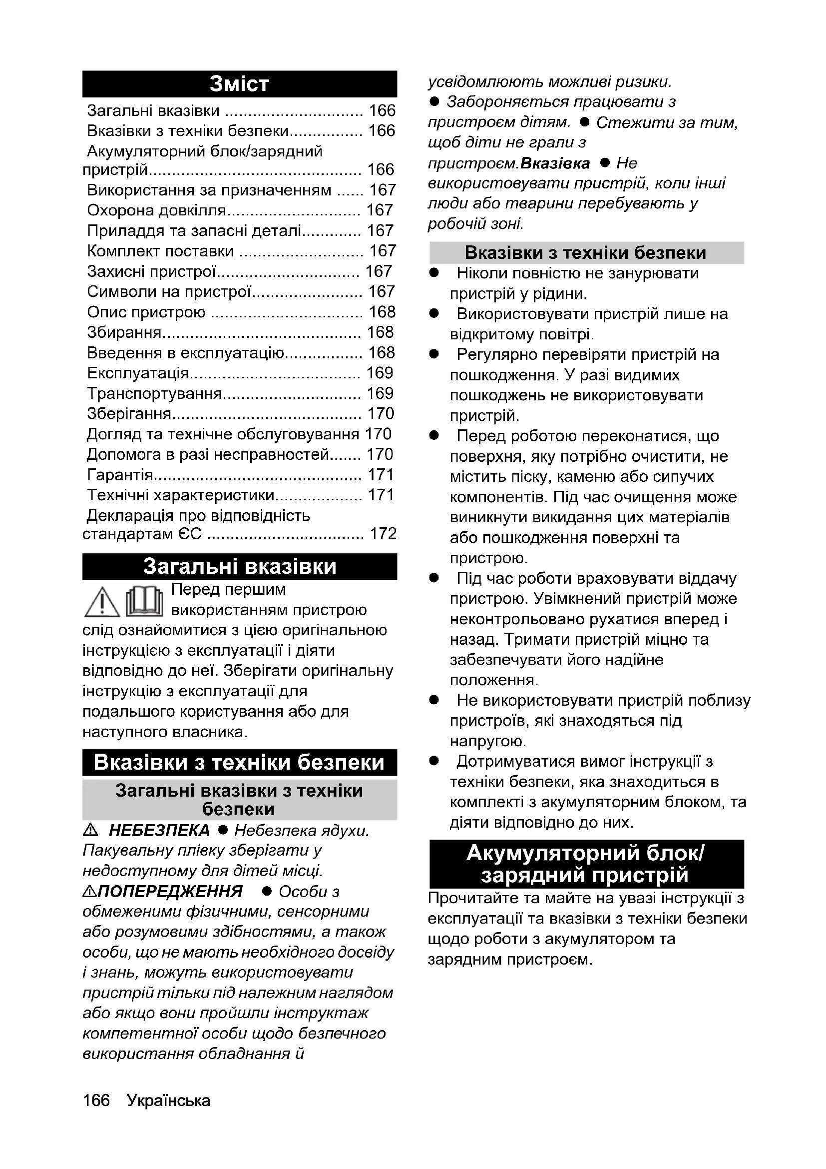 • Дотримуватися вимог інструкції з техніки безпеки, яка знаходиться в комплекті з акумуляторним блоком, та діяти відповідно до них. Акумуляторний блок/ зарядний пристрій Прочитайте та майте на увазі інструкції з експлуатації та вказівки з техніки безпеки щодо роботи з акумулятором та зарядним пристроєм. Загальні вказівки p. 166