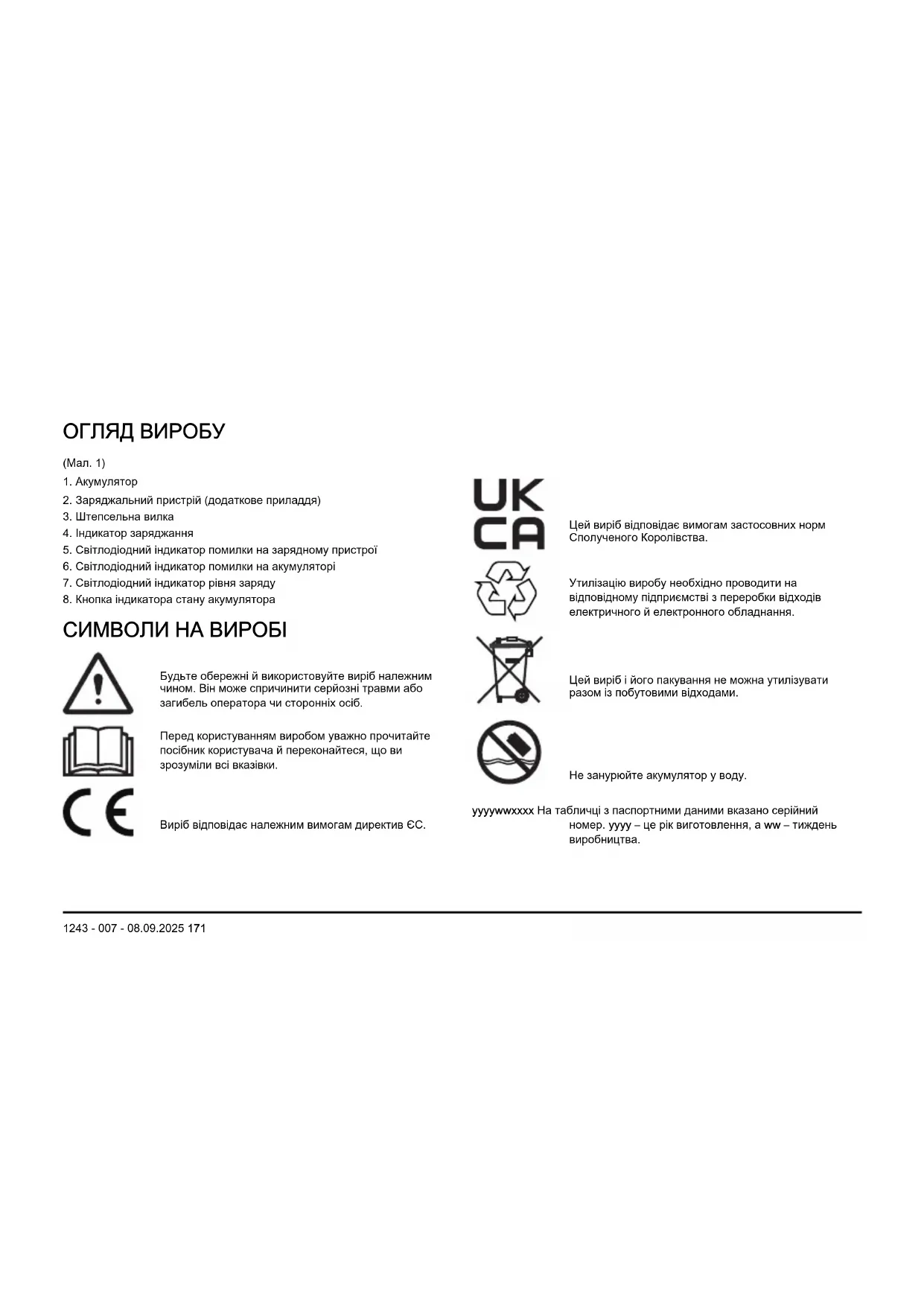 1243 - 007 - 08.09.2025• Не виймайте акумулятор із пакування, якщо не збираєтесь одразу його використовувати.