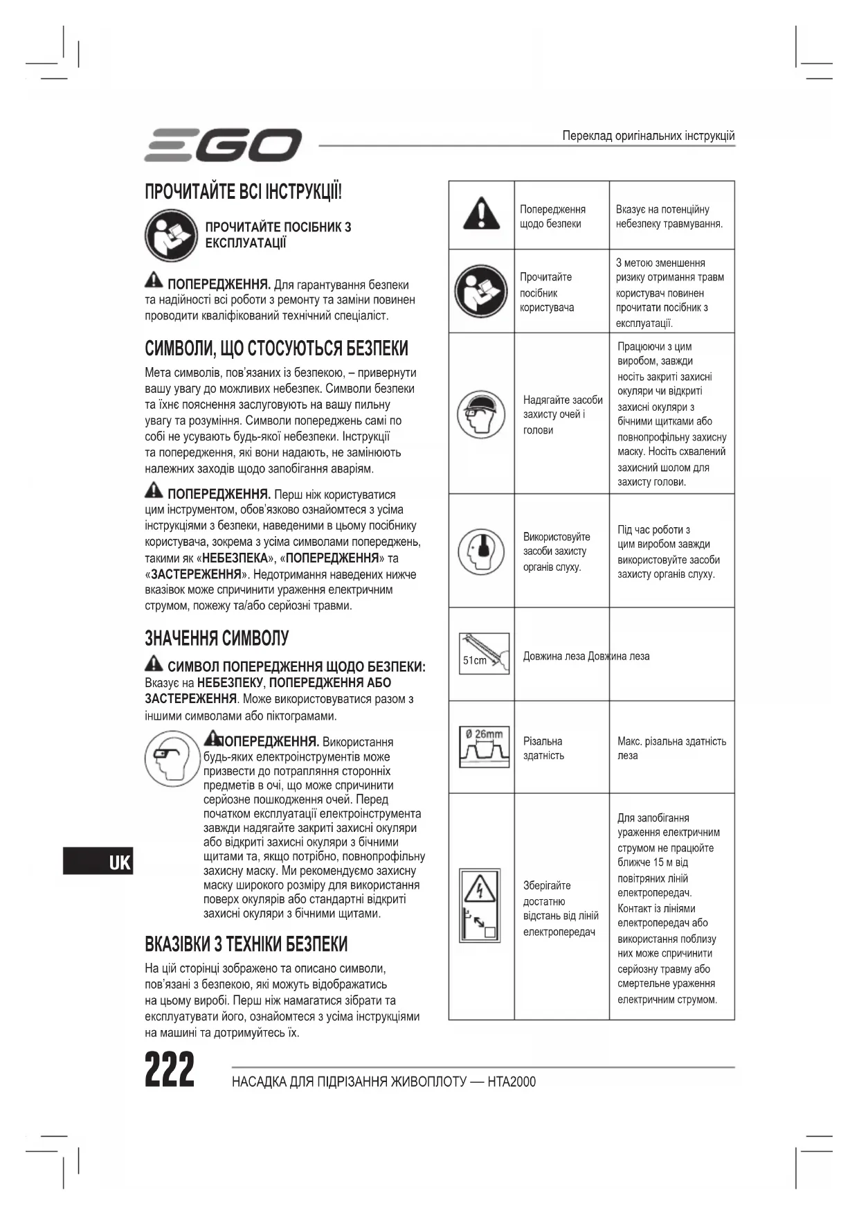 ПРАВИЛА ГАРАНТІЇ EGO Будь ласка, відвідайте веб-сайт egopowerplus.eu для отримання повних умов гарантійної політики EGO.ПРИСТАВКА НОЖИЦА ЗА ЖИВ ПЛЕТ — HTA2000 232