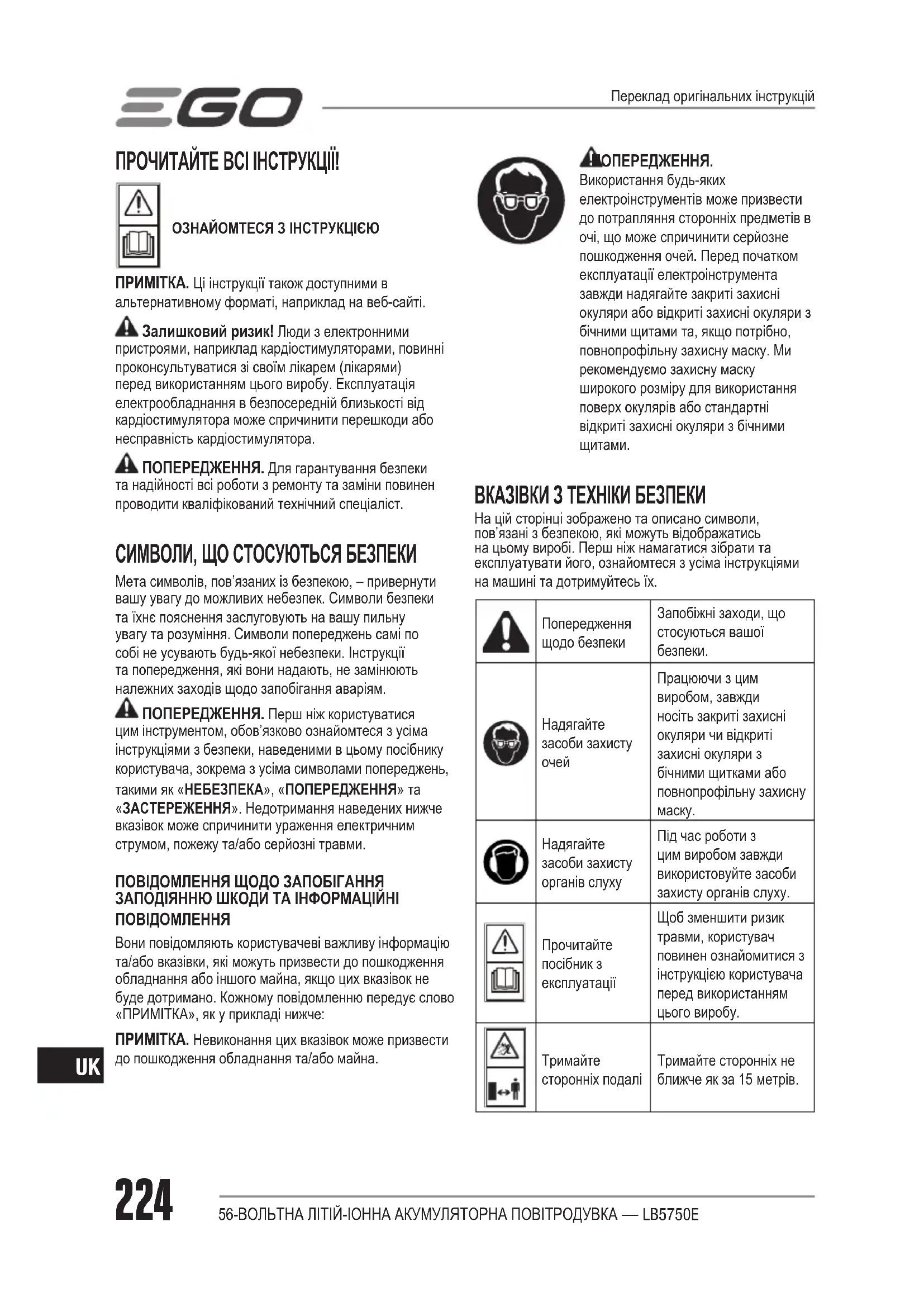 сторонніх подалі Тримайте сторонніх не ближче як за 15 метрів. Переклад оригінальних інструкцій56-ВОЛЬТНА ЛІТІЙ-ІОННА АКУМУЛЯТОРНА ПОВІТРОДУВКА — LB5750E