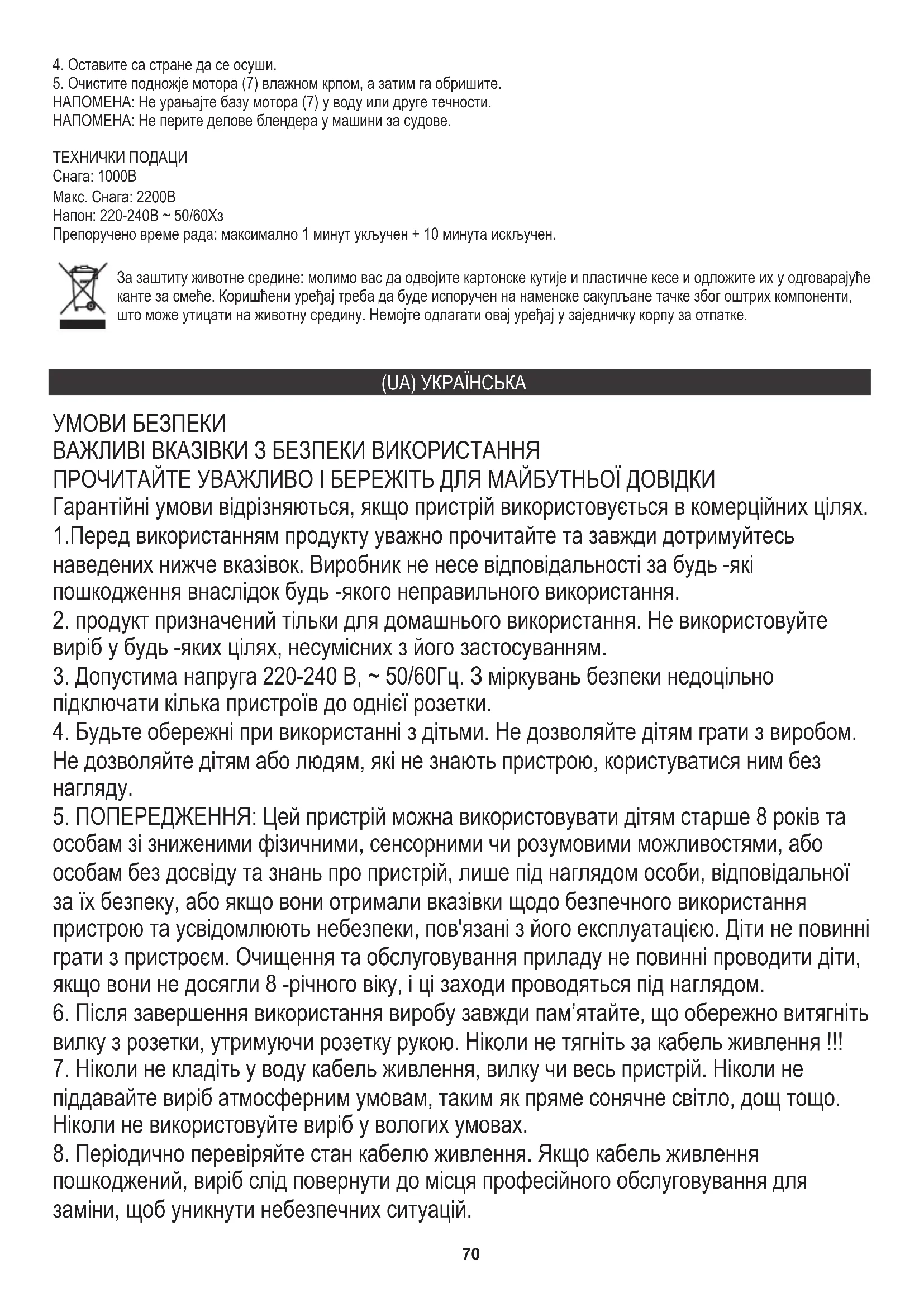 ТЕХНІЧНІ ДАНІ УВАГА: Не мийте будь -які частини блендера в посудомийній машині. Напруга: 220-240В ~ 50/60Гц ОЧИЩЕННЯ ТА ОБСЛУГОВУВАННЯ