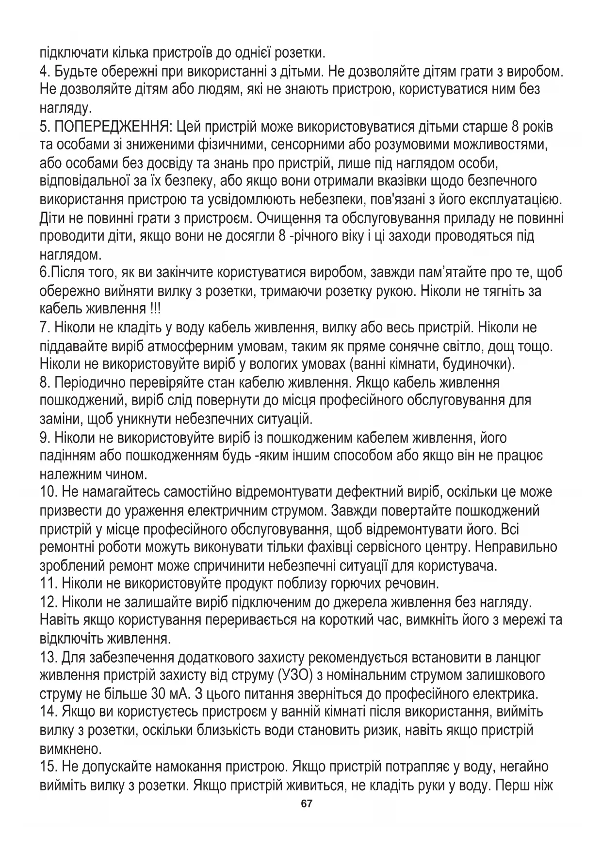 та особами зі зниженими фізичними, сенсорними або розумовими можливостями, або особами без досвіду та знань про пристрій, лише під наглядом особи, відповідальної за їх безпеку, або якщо вони отримали вказівки щодо безпечного використання пристрою та усвідомлюють небезпеки, пов'язані з його експлуатацією. Діти не повинні грати з пристроєм. Очищення та обслуговування приладу не повинні проводити діти, якщо вони не досягли 8 -річного віку і ці заходи проводяться під