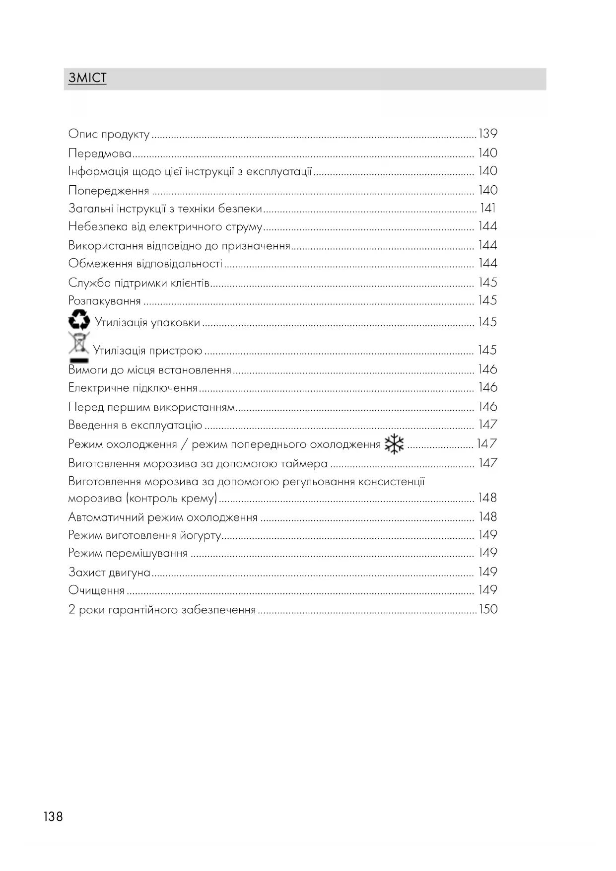 ● Пакувальні матеріали не повинні бути використовані для гри. Існує небезпека задухи. ● Ніколи не використовуйте пристрій поблизу джерела тепла. ● Ніколи не використовуйте пристрій на відкритому повітрі та три- майте його в сухому місці. ● Штепсельну вилку необхідно виймати з розетки під час напов- нення, після кожного використання та перед кожним очищенням. ● Не використовуйте агресивні або абразивні миючі засоби або розчинники. ● Не вишкрібайте тверді забруднення твердими предметами. ● Уникайте зайвого увімкнення та вимкнення пристрою, щоб запо- бігти пошкодженню компресора. Тримайте інтервал у 5 хвилин між увімкненням і вимкненням пристрою. ● Щоб уникнути пожежі або короткого замикання, в пристрій не можна вставляти металеві листи або інші електричні предмети. ● Не стукайте по поверхні або краю ємності будь-яким іншим предметом під час видалення морозива, щоб уникнути пошкодження контей- нера.143