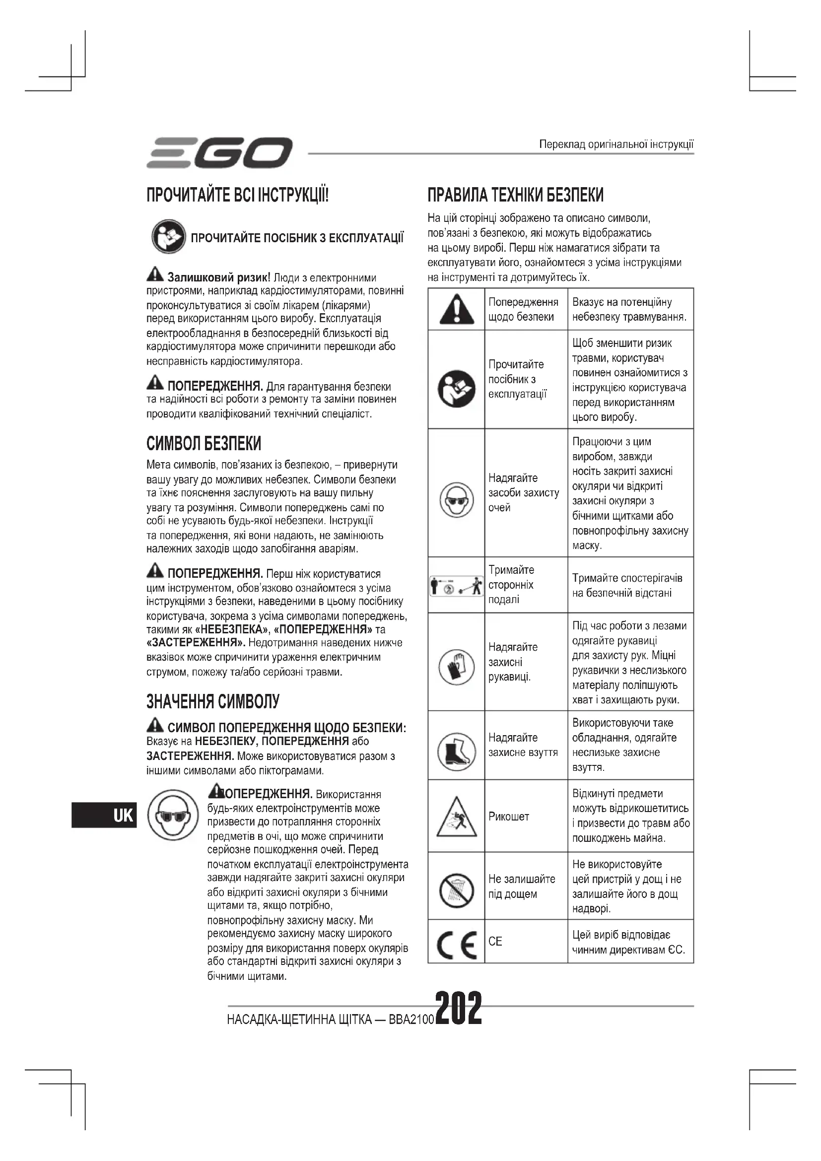 ПОСІБНИК КОРИСТУВАЧА BBA2100 EGO