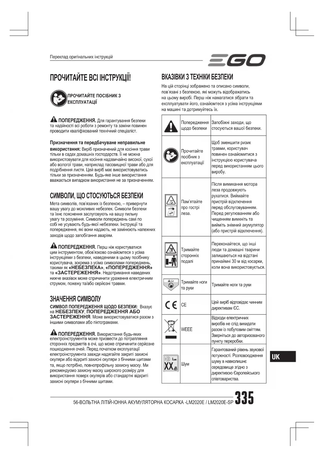 ПРОЧИТАЙТЕ ВСІ ІНСТРУКЦІЇ! ПРОЧИТАЙТЕ ПОСІБНИК З ЕКСПЛУАТАЦІЇ ПОПЕРЕДЖЕННЯ. Для гарантування безпеки та надійності всі роботи з ремонту та заміни повинен проводити кваліфікований технічний спеціаліст.Призначення та передбачуване неправильне використання: Виріб призначений для косіння трави тільки в садах домашніх господарств. Її не можна використовувати для косіння надзвичайно високої, сухої або вологої трави, наприклад пасовищної трави або для подрібнення листя. Цей виріб має використовуватись тільки за призначенням. Будь-яке інше використання вважається випадком використання не за призначенням. СИМВОЛИ, ЩО СТОСУЮТЬСЯ БЕЗПЕКИ Мета символів, пов’язаних із безпекою, – привернути вашу увагу до можливих небезпек. Символи безпеки та їхнє пояснення заслуговують на вашу пильну увагу та розуміння. Символи попереджень самі по собі не усувають будь-якої небезпеки. Інструкції та попередження, які вони надають, не замінюють належних заходів щодо запобігання аваріям. ПОПЕРЕДЖЕННЯ. Перш ніж користуватися цим інструментом, обов’язково ознайомтеся з усіма інструкціями з безпеки, наведеними в цьому посібнику користувача, зокрема з усіма символами попереджень, такими як «НЕБЕЗПЕКА», «ПОПЕРЕДЖЕННЯ» та «ЗАСТЕРЕЖЕННЯ». Недотримання наведених нижче вказівок може спричинити ураження електричним струмом, пожежу та/або серйозні травми. ЗНАЧЕННЯ СИМВОЛУ СИМВОЛ ПОПЕРЕДЖЕННЯ ЩОДО БЕЗПЕКИ: Вказує на НЕБЕЗПЕКУ, ПОПЕРЕДЖЕННЯ АБО ЗАСТЕРЕЖЕННЯ. Може використовуватися разом з іншими символами або піктограмами. ПОПЕРЕДЖЕННЯ. Використання будь-яких електроінструментів може призвести до потрапляння сторонніх предметів в очі, що може спричинити серйозне пошкодження очей. Перед початком експлуатації електроінструмента завжди надягайте закриті захисні окуляри або відкриті захисні окуляри з бічними щитами та, якщо потрібно, повнопрофільну захисну маску. Ми рекомендуємо захисну маску широкого розміру для використання поверх окулярів або стандартні відкриті захисні окуляри з бічними щитами. ВКАЗІВКИ З ТЕХНІКИ БЕЗПЕКИ На цій сторінці зображено та описано символи, пов’язані з безпекою, які можуть відображатись на цьому виробі. Перш ніж намагатися зібрати та експлуатувати його, ознайомтеся з усіма інструкціями на машині та дотримуйтесь їх.Попередження щодо безпекиЗапобіжні заходи, що стосуються вашої безпеки.Прочитайте посібник з експлуатаціїЩоб зменшити ризик травми, користувач повинен ознайомитися з інструкцією користувача перед використанням цього виробу.Пам’ятайте про гострі леза.Після вимикання мотора леза продовжують рухатися. Виймайте пристрій відключення перед обслуговуванням. Перед регулюванням або чищенням вимкніть та вийміть знімний акумулятор (або пристрій відключення).Тримайте сторонніх подаліПереконайтеся, що інші люди та домашні тварини залишаються на відстані принаймні 30 м від косарки, коли вона використовується.Тримайте ноги та рукиТримайте ноги та руки Цей виріб відповідає чинним директивам ЄС. WEEE Відходи електричних виробів не слід викидати разом із побутовим сміттям. Зверніться до авторизованого пункту переробки.